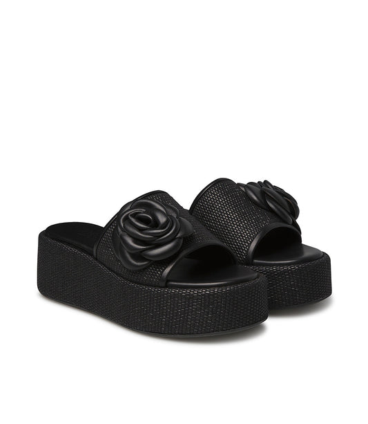 Sandalo zeppa in rafia nero con fiore