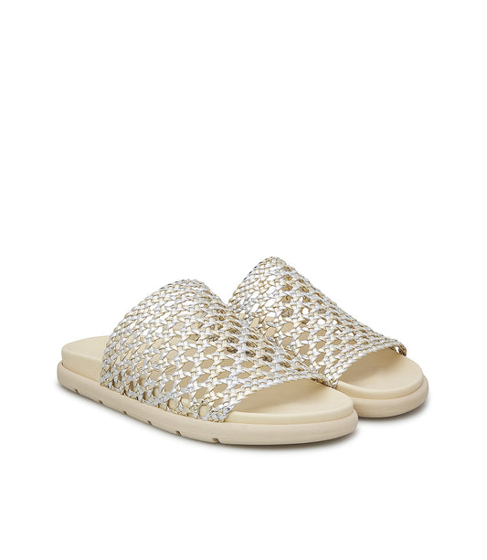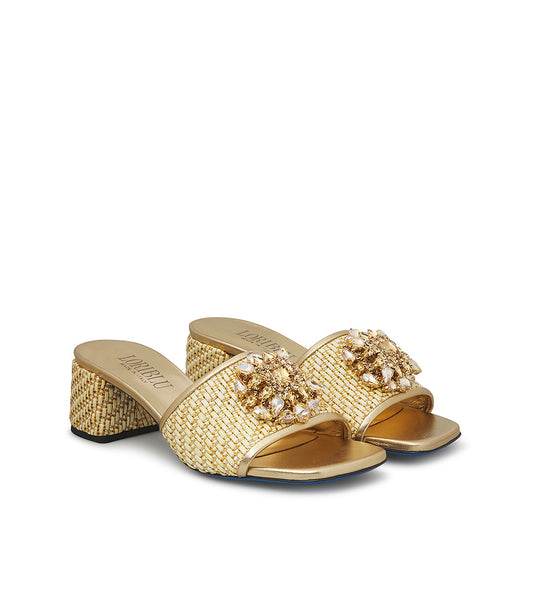 Mule in rafia e nappa oro con gioiello