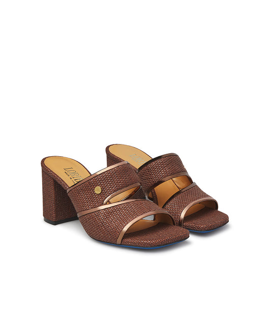 Mules in rafia e vernice bronzo