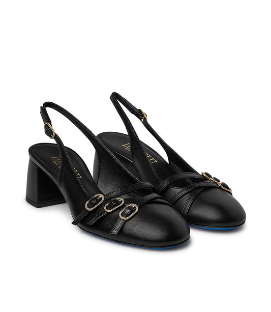 Decorative straps black nappa leather slingback pumps