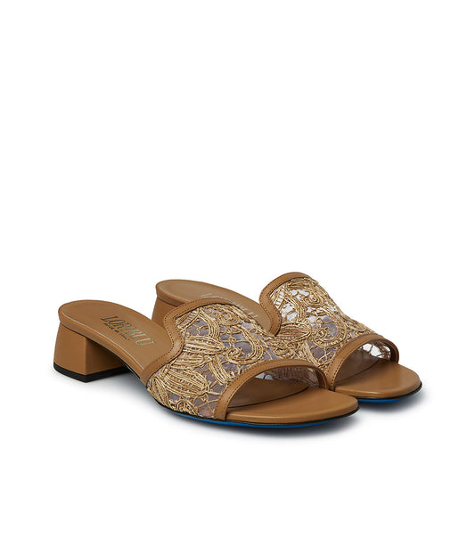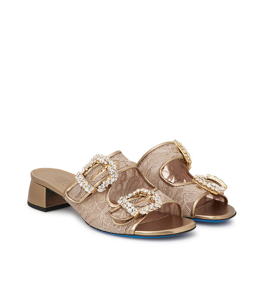 Gold tone leather and lace jewel buckled mules