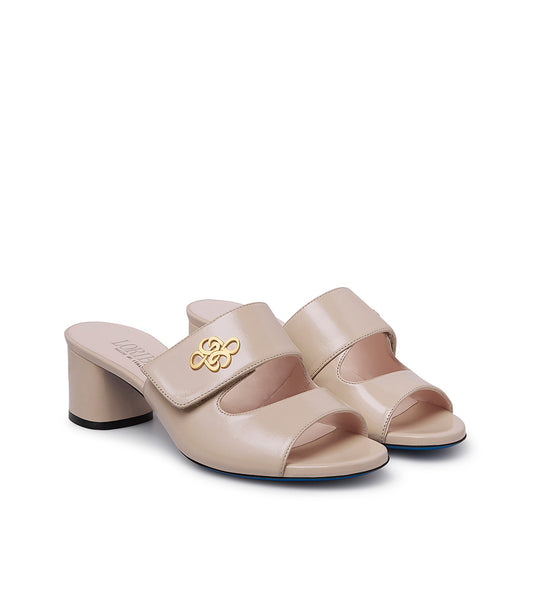 gold metal logo sand leather mules