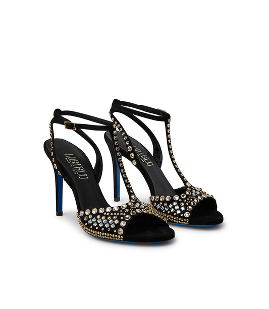 Black satin and suede jewel sandal