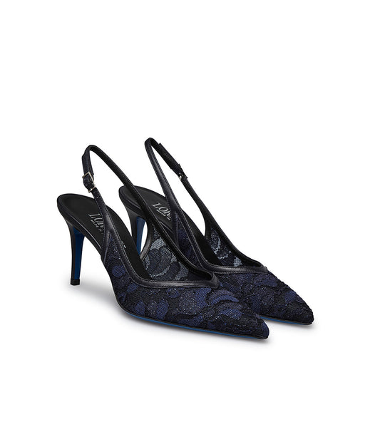 Navy blue lace and leather slingback pumps