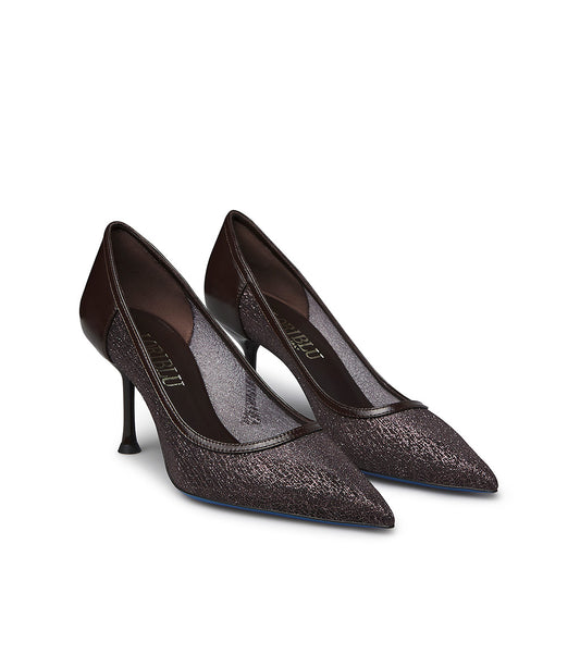 Brown patent leather and tricot pumps