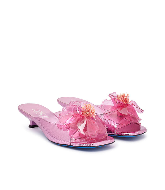 Flash fuchsia laminated mirror leather sandals with flower decoration