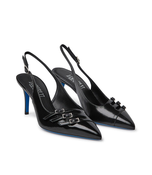 Decorative straps black nappa leather slingback pumps