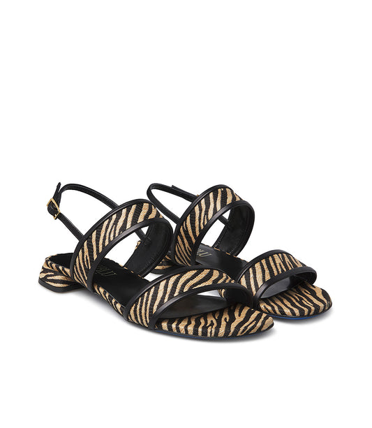 Low sandal in black nappa and zebra-print raffia