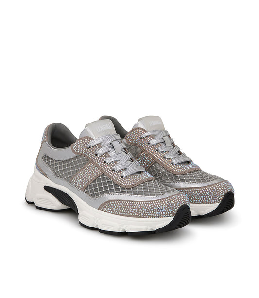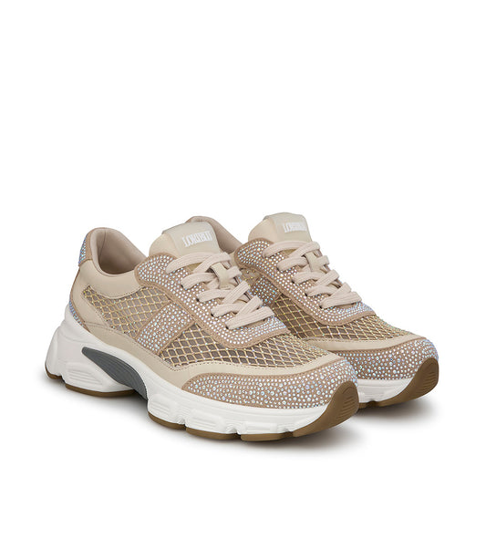 Sneaker in camoscio beige con cristalli e eco pelliccia