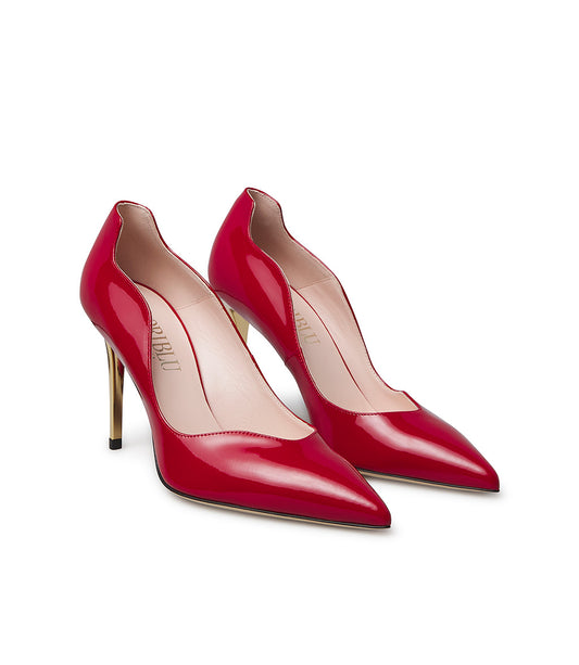 Décolletè in vernice rosso con tacco scultura in metallo oro