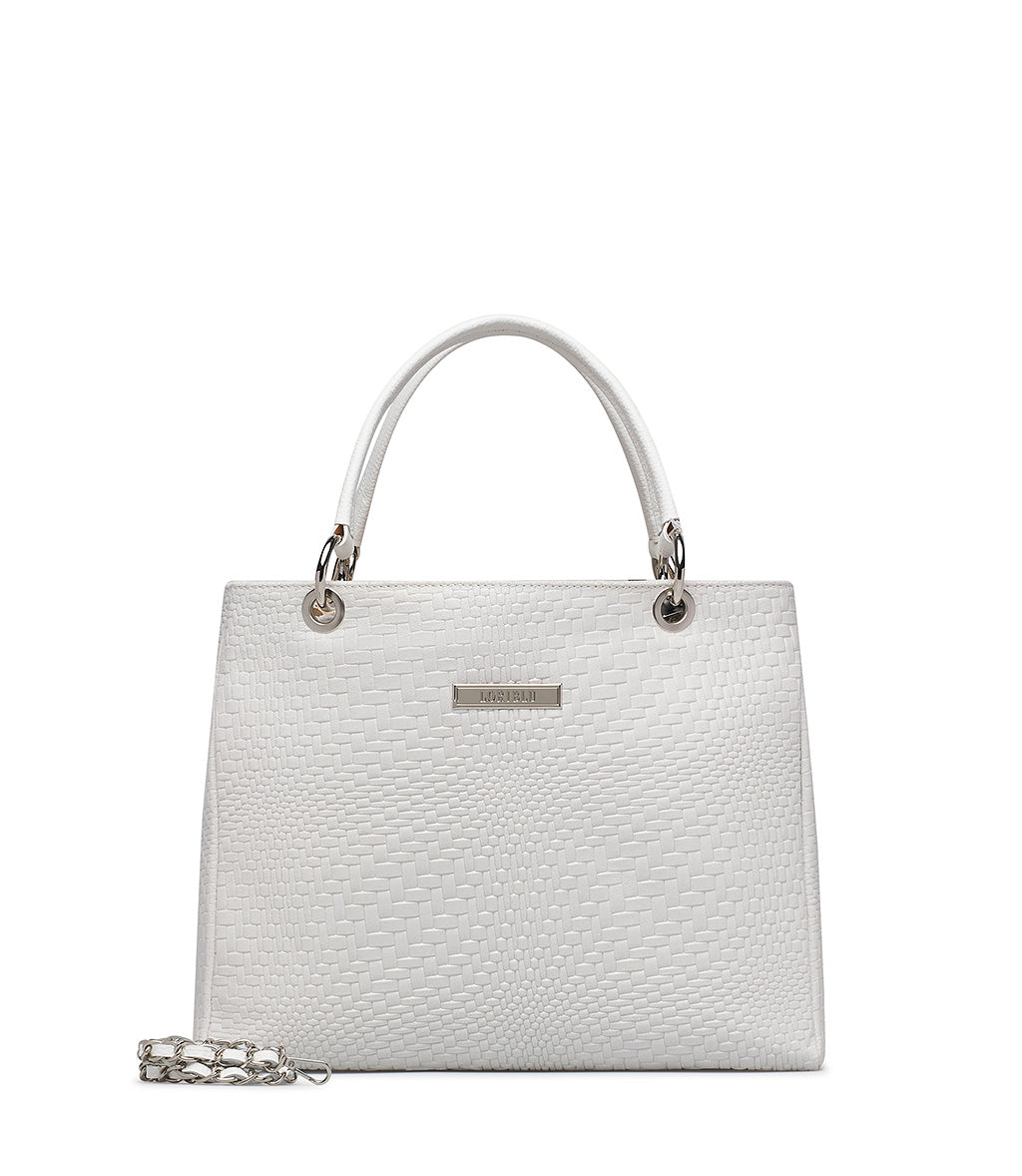 Ideale come borsa quotidiana, la nostra borsa tote in rafia panna presenta un raffinato motivo intrecciato, manico superiore in pelle liscia e tracolla con catena in metallo argento, iconica placca-logo frontale e hardware in metallo argento. 100% made in Italy, è perfetta da portare sempre con te, dall’ufficio all’ora dell’aperitivo.