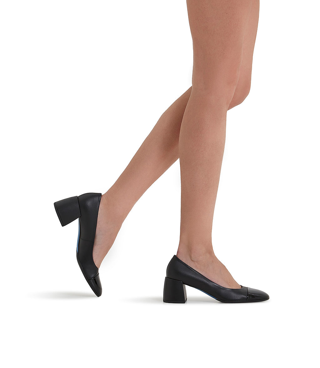Realizzate in Italia pregiata nappa nera con dettaglio in vernice, le nostre décolleté uniscono eleganza e comfort alla perfezione. Poggiano su di un tacco midi a blocco leggermente svasato e rivelano una classica silhouette con punta arrotondata. Sfoggiale con una gonna tubino e una camicia sartoriale.