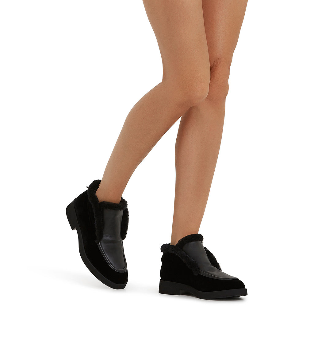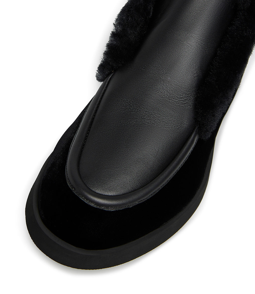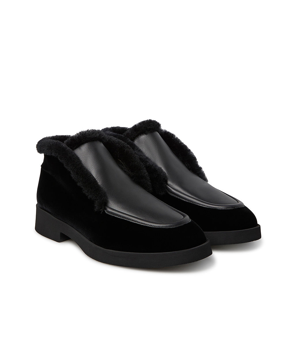 Mocassini in velluto e nappa nera. Ideali da indossare durante la stagione più fredda, sono foderati e rifiniti in caldo shearling tone-on-tone e rivelano una punta a mandorla arrotondata, la nostra distintiva medaglia dorata con logo impresso sul retro e una suola in gomma con tacco basso.