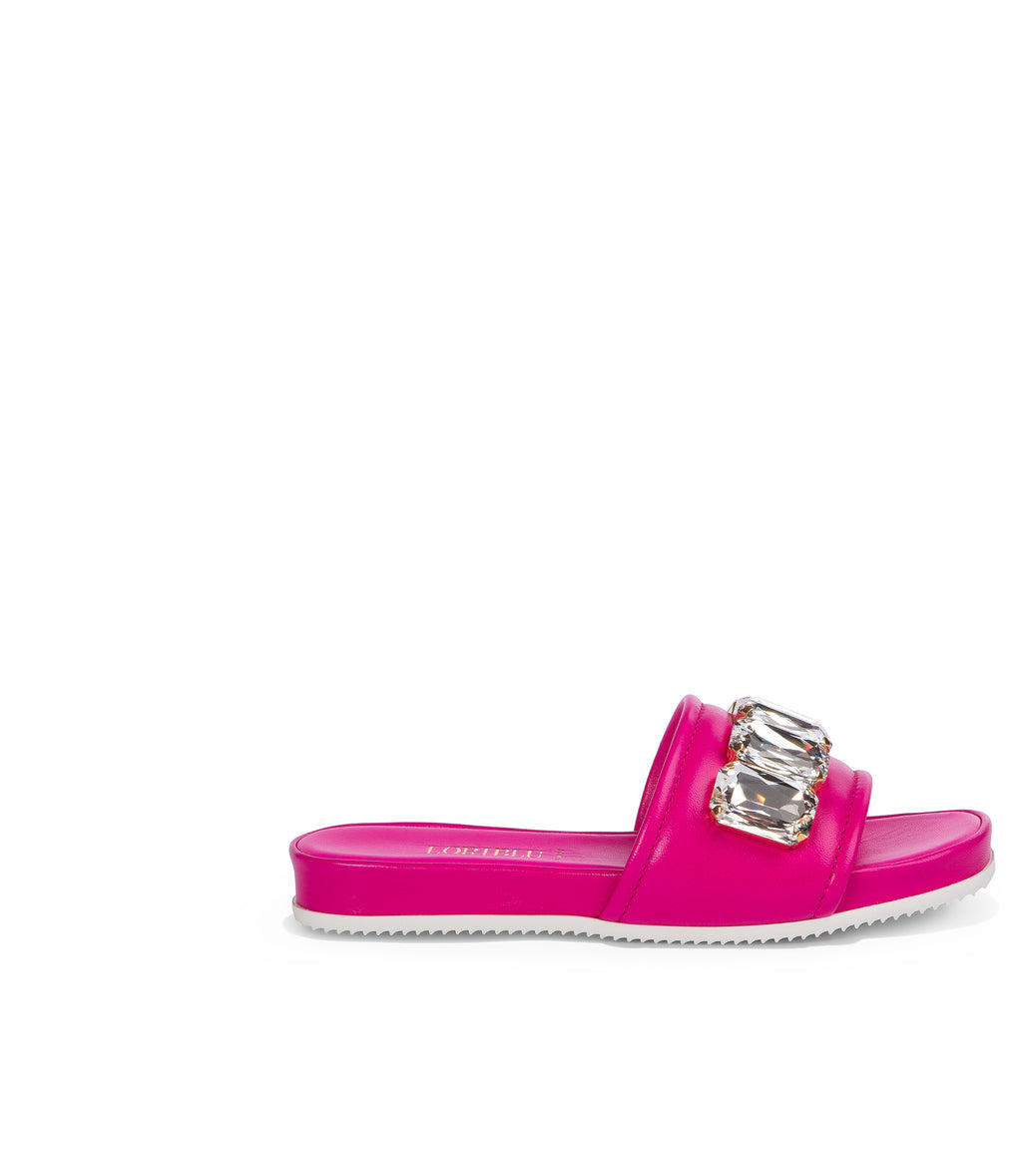 I nostri sandali flat in morbida nappa catturano l’attenzione grazie alla vivace tonalità fucsia e ai macro cristalli applicati sulla fascia frontale. Realizzati in Italia, presentano una confortevole soletta in pelle e fondo della suola in gomma bianca antiscivolo. Indossali con outfits color-block di tendenza.