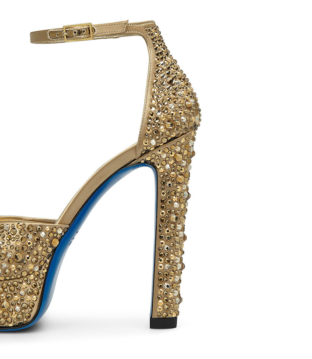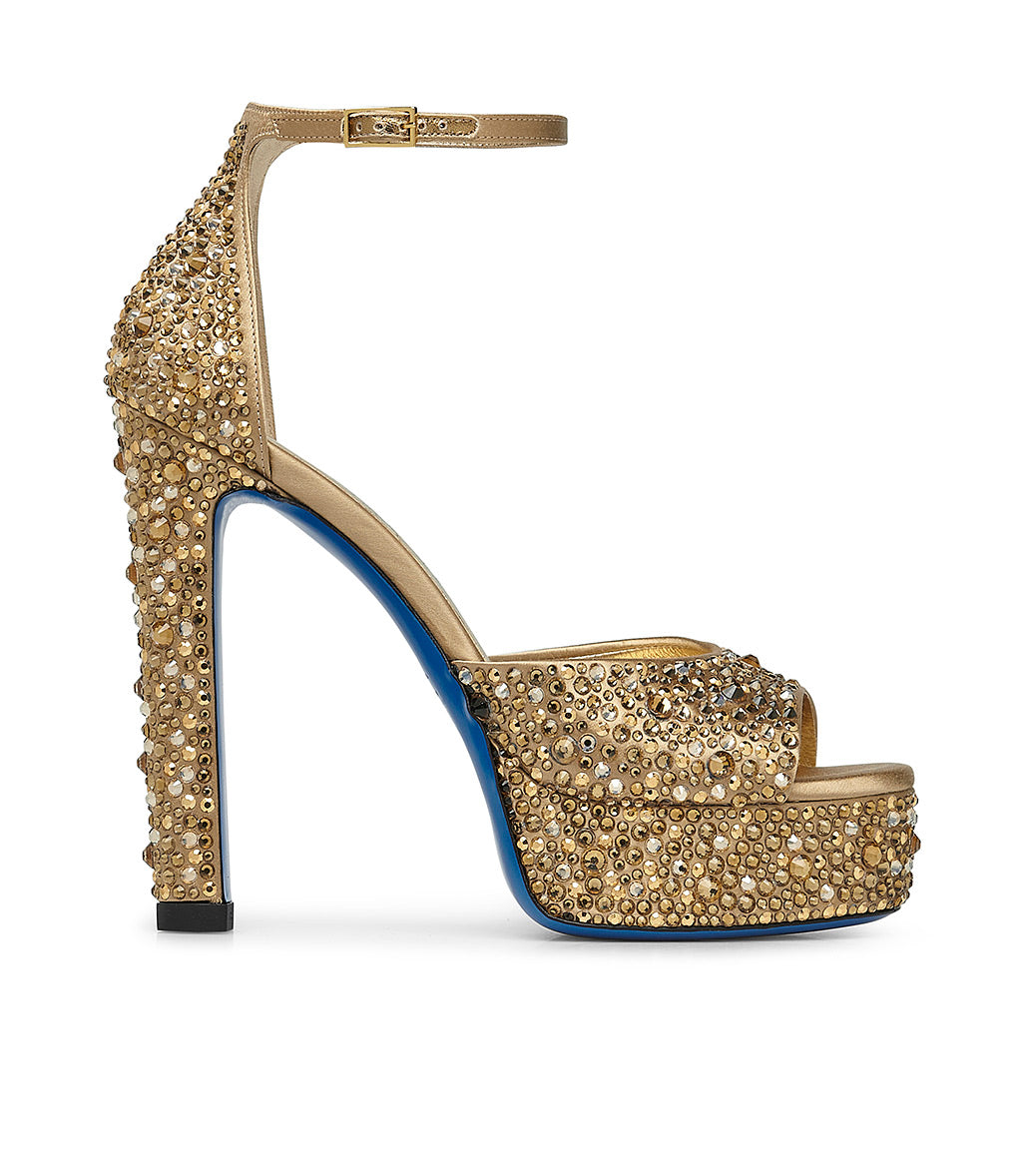 Realizzati in Italia in raso dorato, i nostri esclusivi sandali con platform catturano lo sguardo grazie alla decorazione in cristalli all-over. Rivelano una punta arrotondata, cinturino sottile e regolabile alla caviglia, un vertiginoso tacco a blocco e la nostra iconica suola in cuoio blu. Sfoggiali con le tue mise più glamour e femminili.