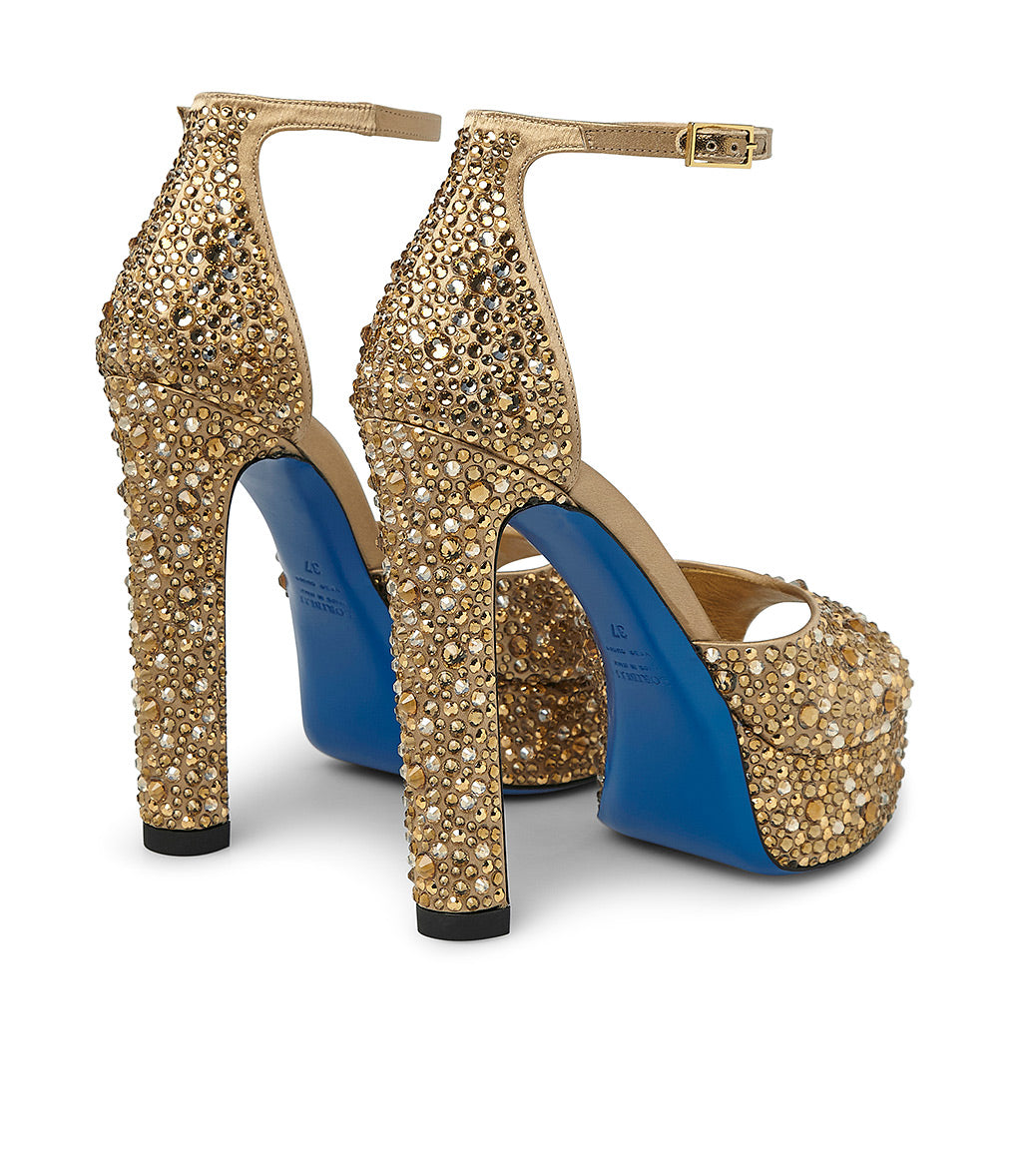 Sandali in raso oro con cristalli e platform