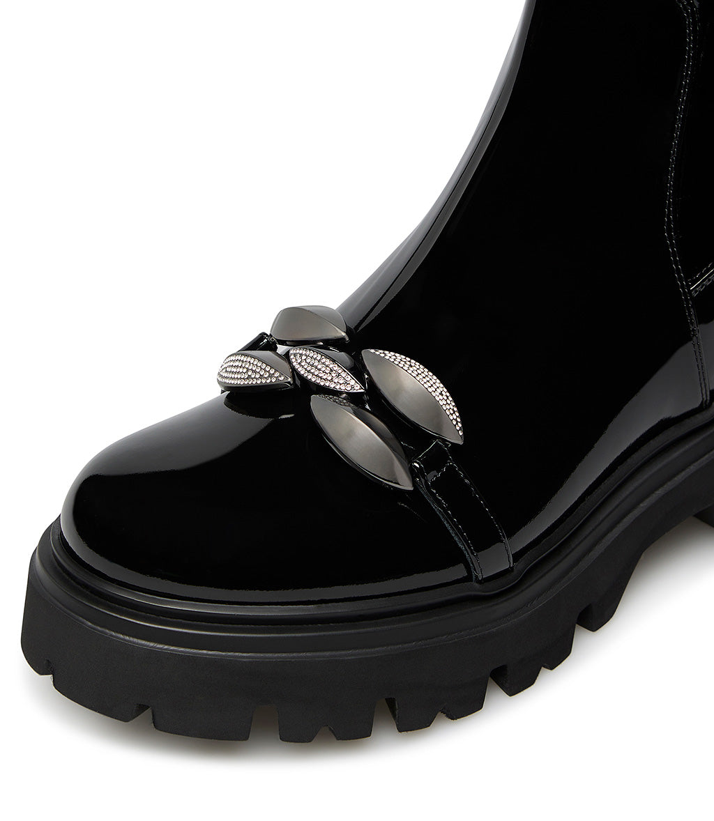 stones decorated black patetn leather combat ankle boots