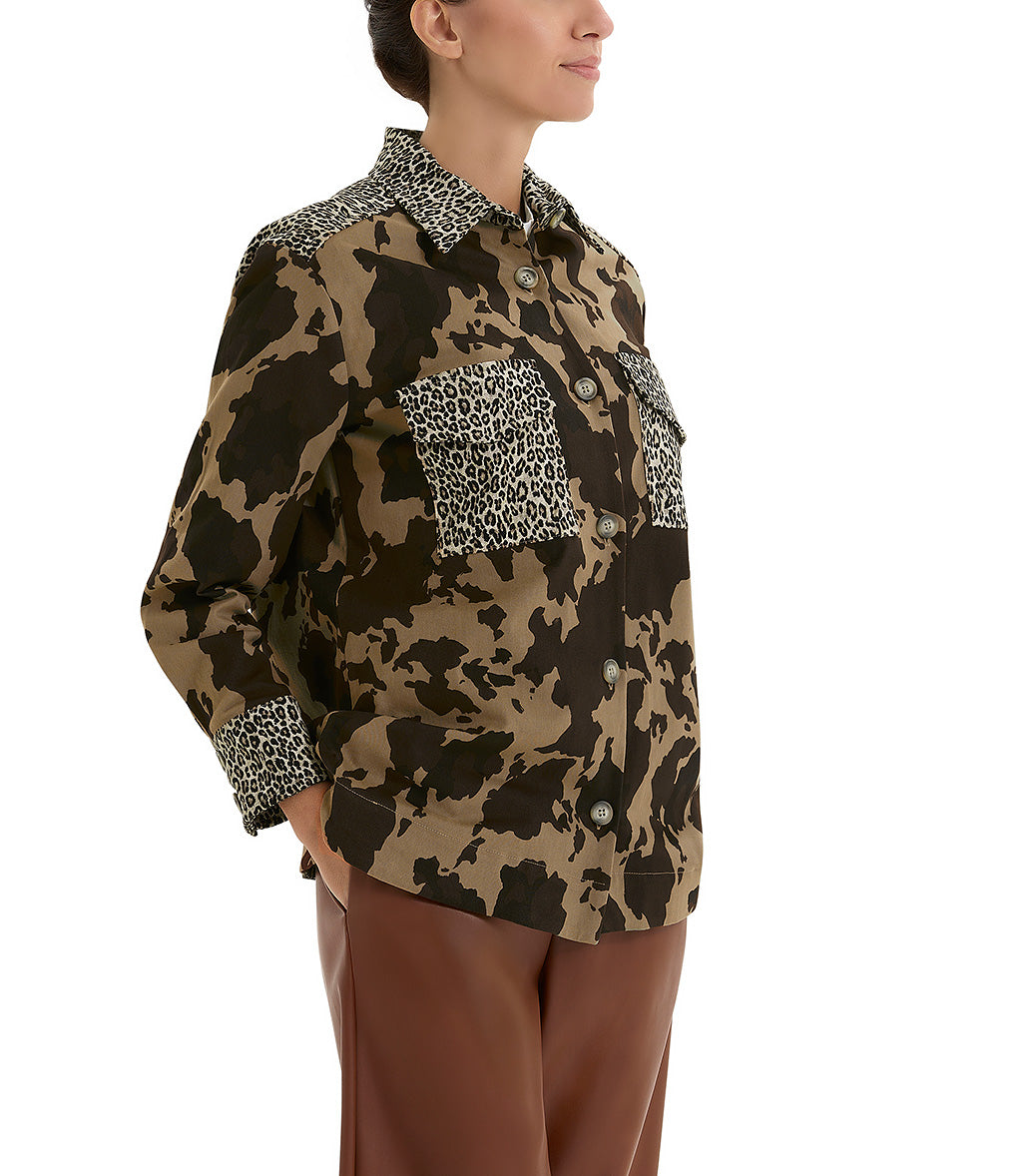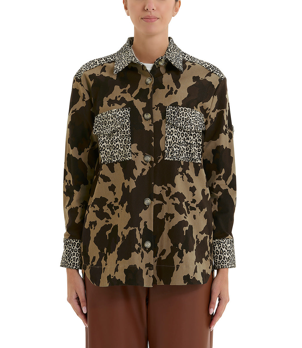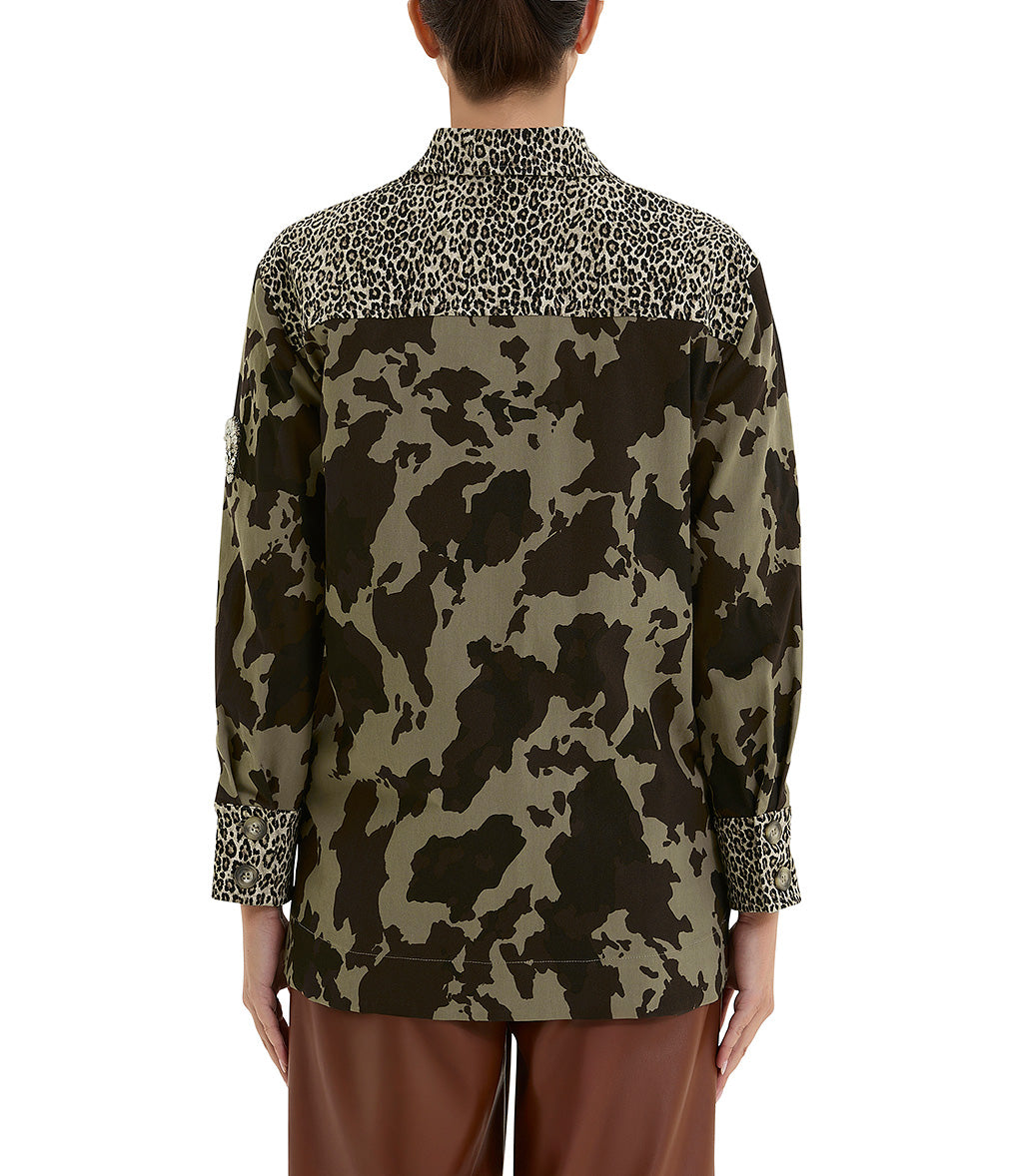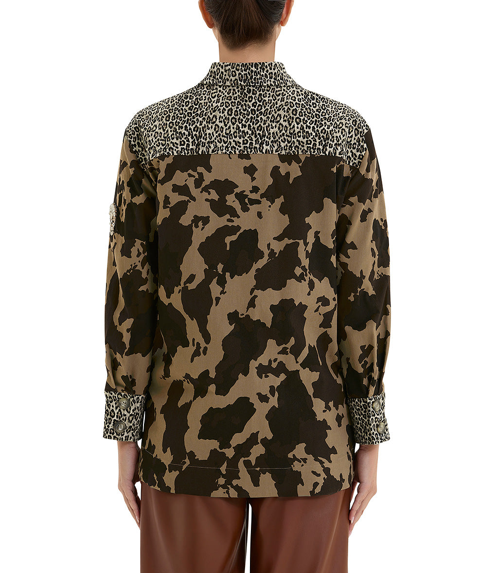 Classic cotton lapel shirt, cuffs, patch pockets with flaps, military and leopard print in shades of orange. All embellished with a glitter skull on the left sleeve.