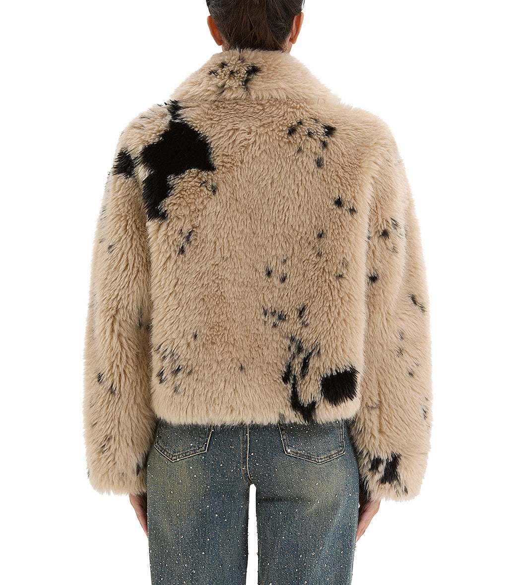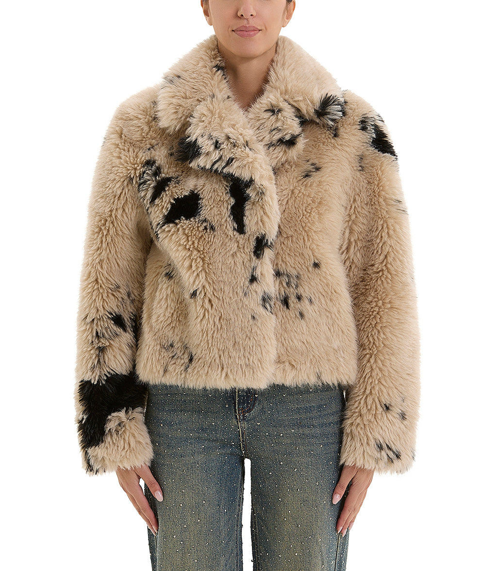 Short beige faux fur coat with black animal-print spots. Soft and voluminous to touch, featuring a classic notch collar and a center-front closure.