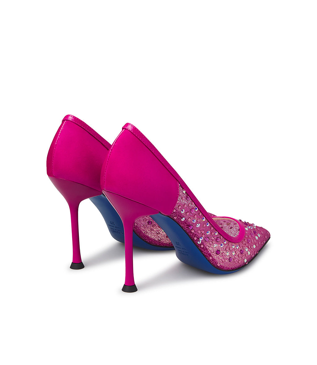 Glamorous and feminine, our impeccably designed pumps are perfect for adding a touch of class to your elegant and formal outfits. They're crafted in Italy from fucshia tricot embellished with iridescent crystals, with patent leather details and trim. The iconic blue leather sole and elegant stiletto heel complete this understated and timeless style.