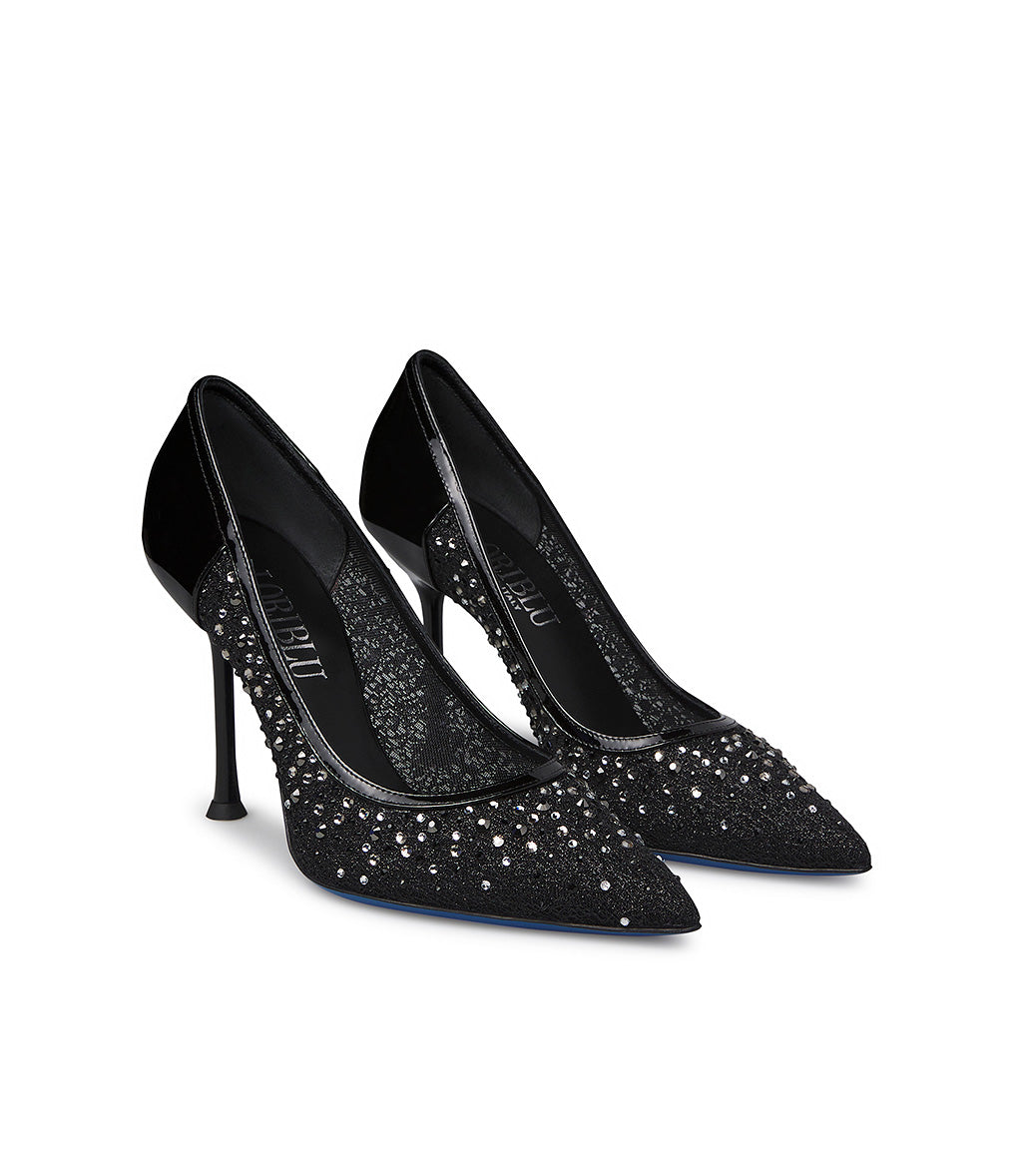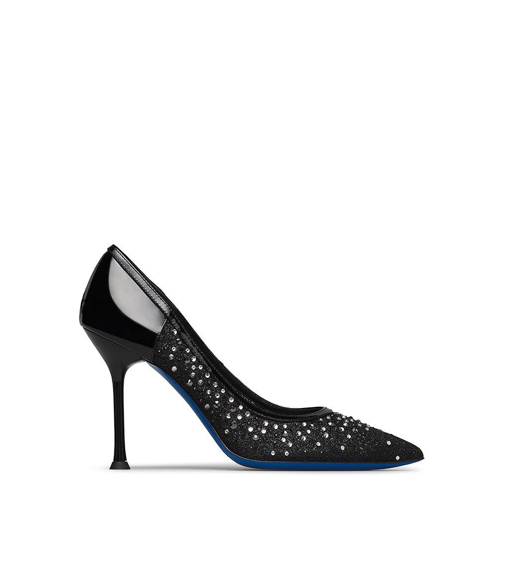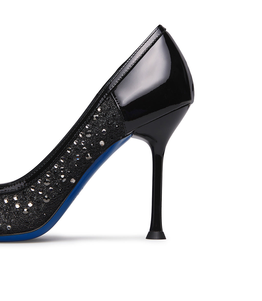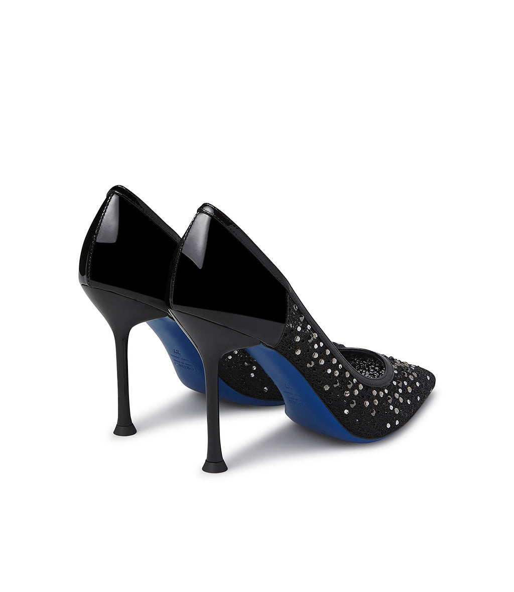 Glamorous and feminine, our impeccably designed pumps are perfect for adding a touch of class to your elegant and formal outfits. They're crafted in Italy from black tricot embellished with silver-toned crystals, with patent leather details and trim. The iconic blue leather sole and elegant stiletto heel complete this understated and timeless style.