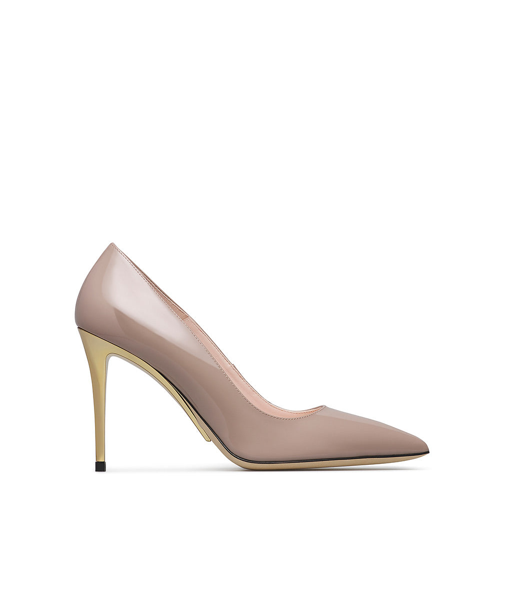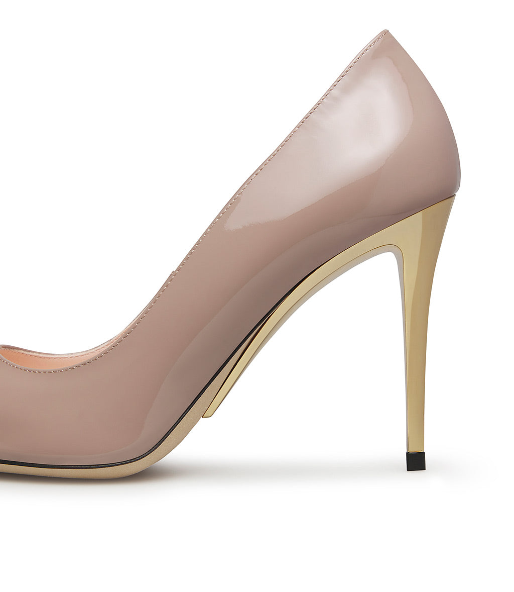 Almond-tone patent leather pumps with gold metal sculpture heel