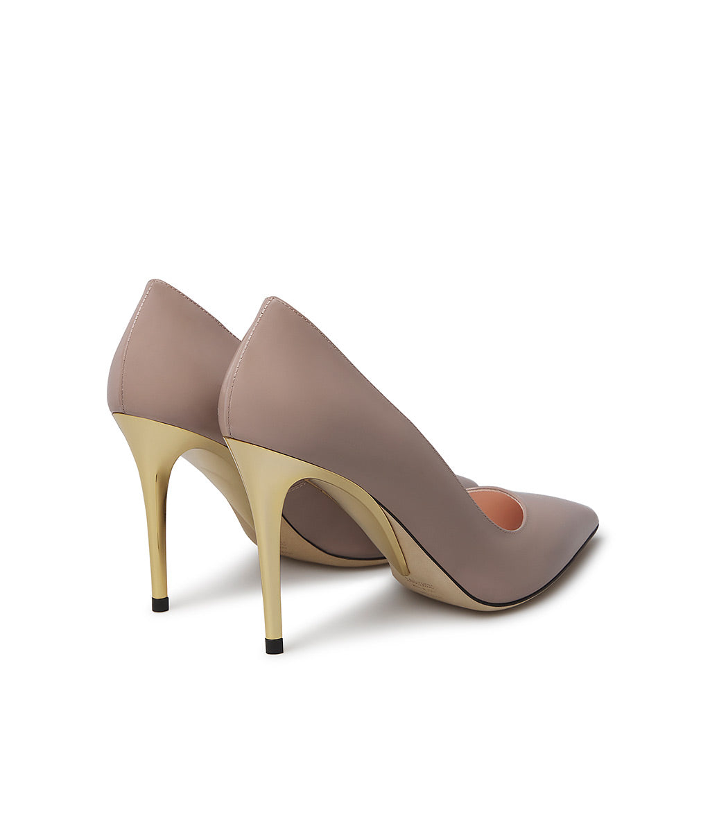 Made in Italy, our pumps are refined, feminine, and timeless. Crafted from premium patent leather in almond shade, they stand out thanks to their sculptural gold metal heel and refined silhouette. Featuring a pointed toe and natural leather sole, they're the perfect accessory to complement your elegant outfits.