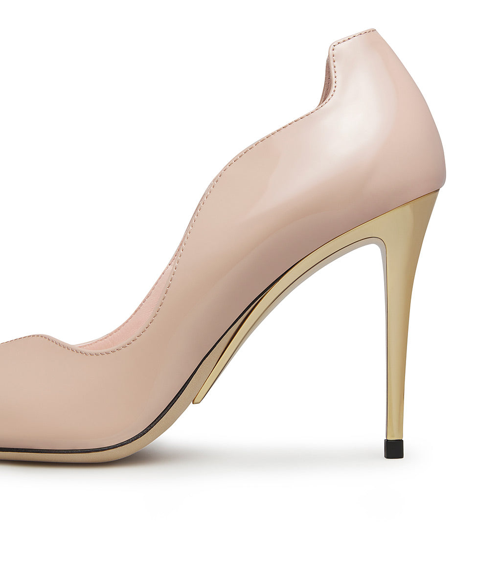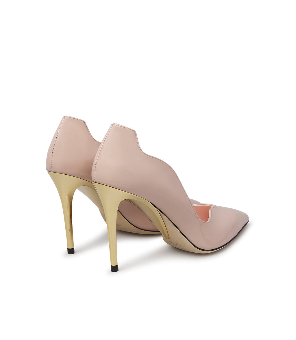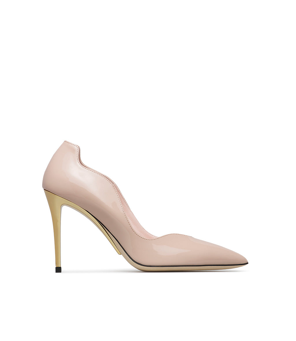 Feminine and refined, our pumps stand out thanks to their iconic wave design. The elegance of the nude patent leather upper is enhanced by a soaring gold metal sculptural heel. Let yourself be seduced by our new pumps and pair them with soft sweaters and midi skirts for the perfect mix and match to show off at your next cocktail party.