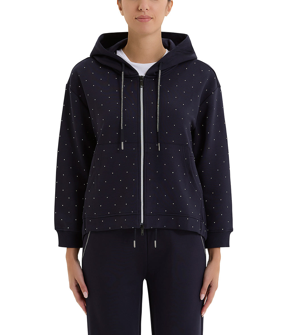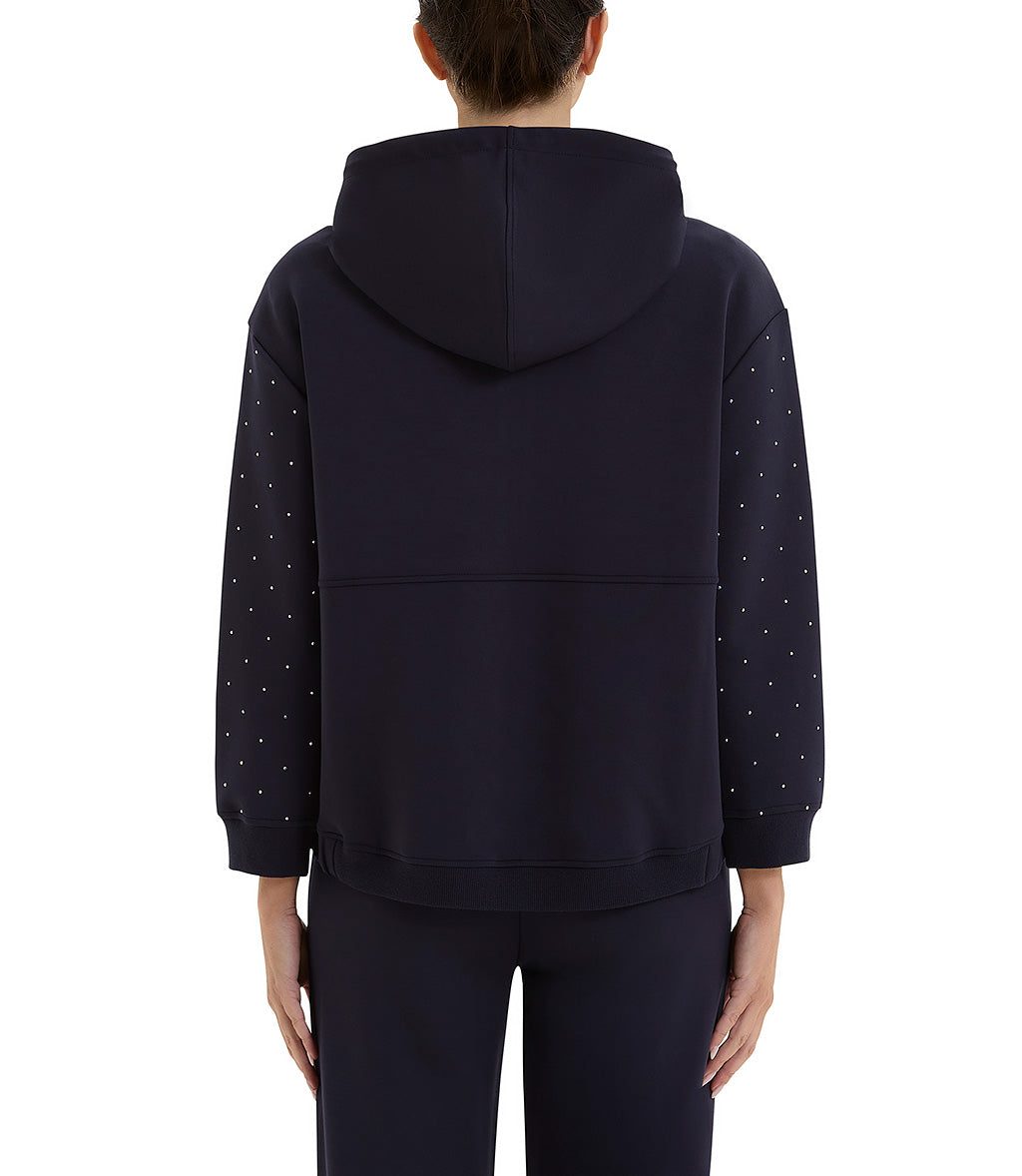 Blue viscose and polyester oversized hooded sweatshirt with silver zip and tiny bright studs covering the entire circumference, the sleeves, the front and hood drawstrings.