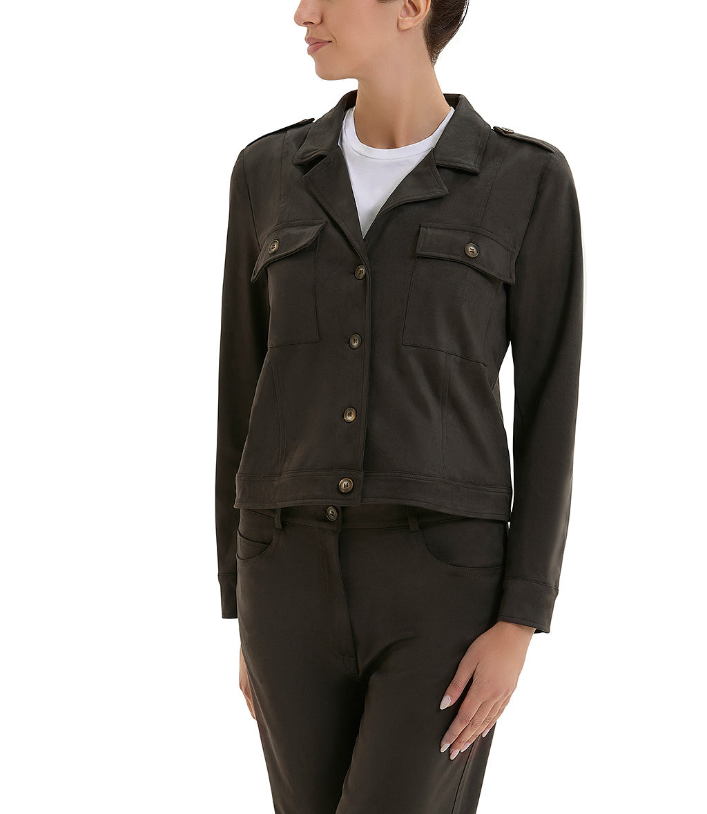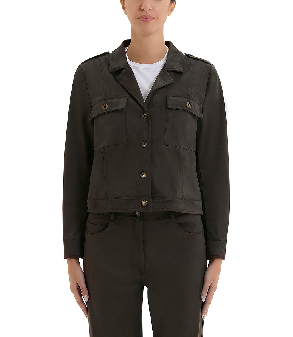 Polyester long-sleeve jacket chocolat-colored suede effect with cuffs it features a classic lapel and two front flap pockets.