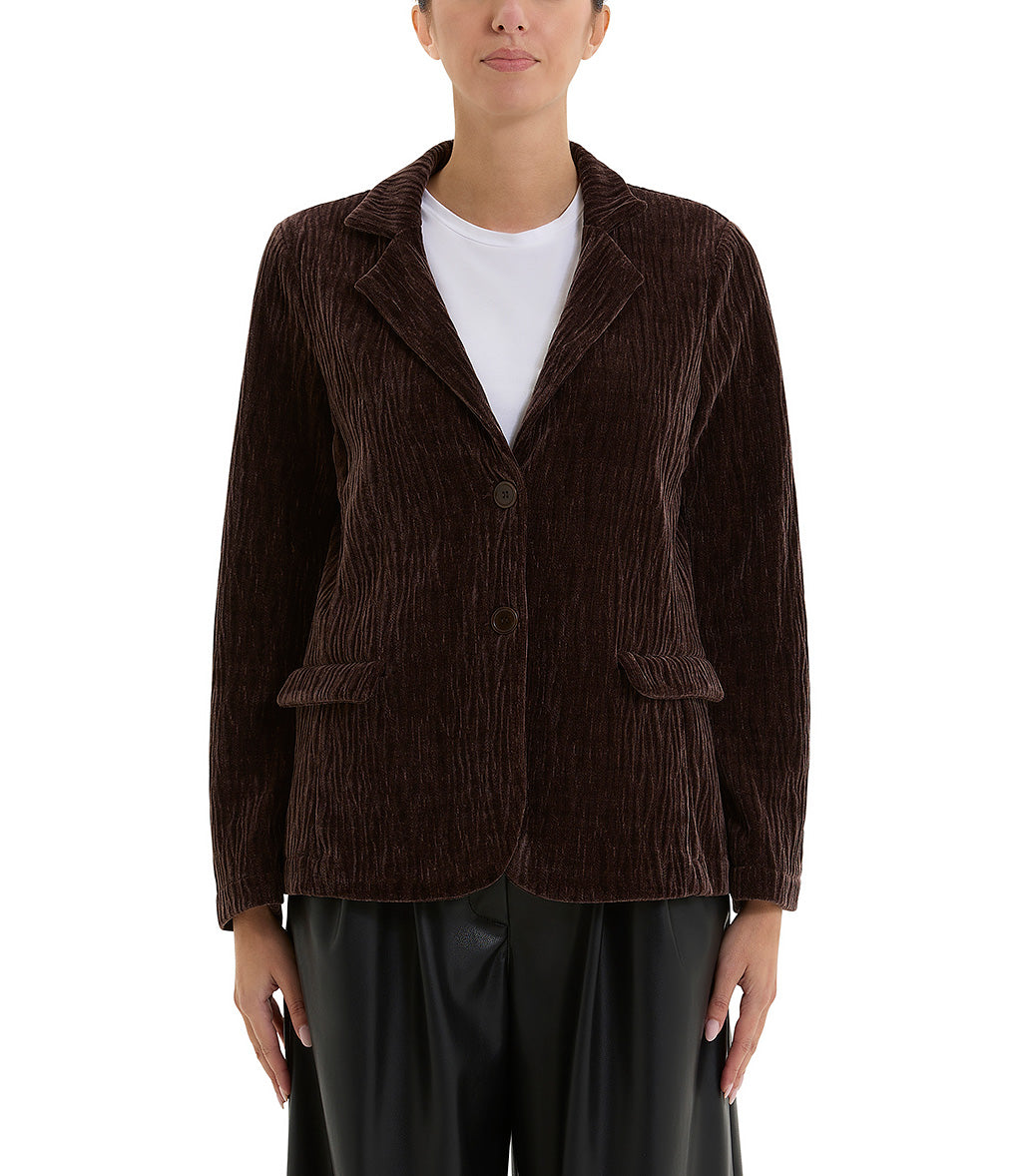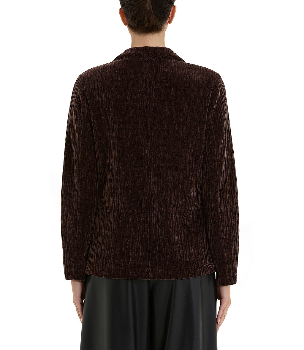 Brown single-breasted jacket with lapels,long sleeves, and welt flap pockets.