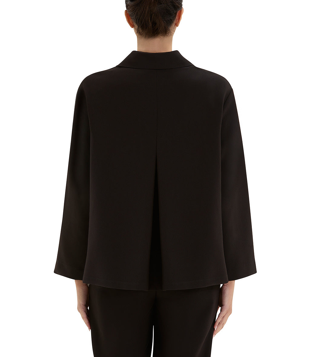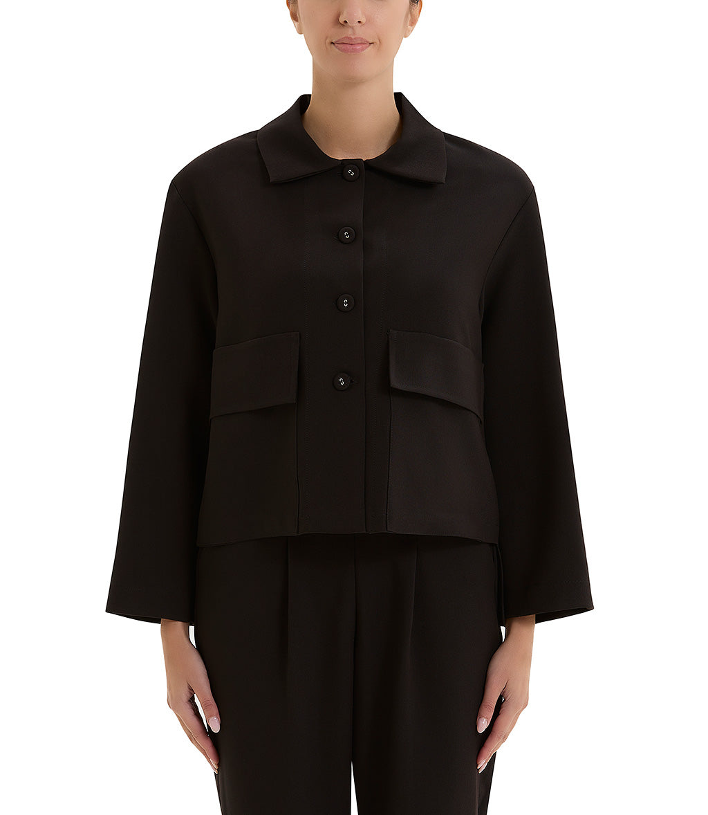 Jacket with notch lapel collar and long sleeves. Front button placket with fabric-covered two-hole buttons and two flap pockets with flaps.