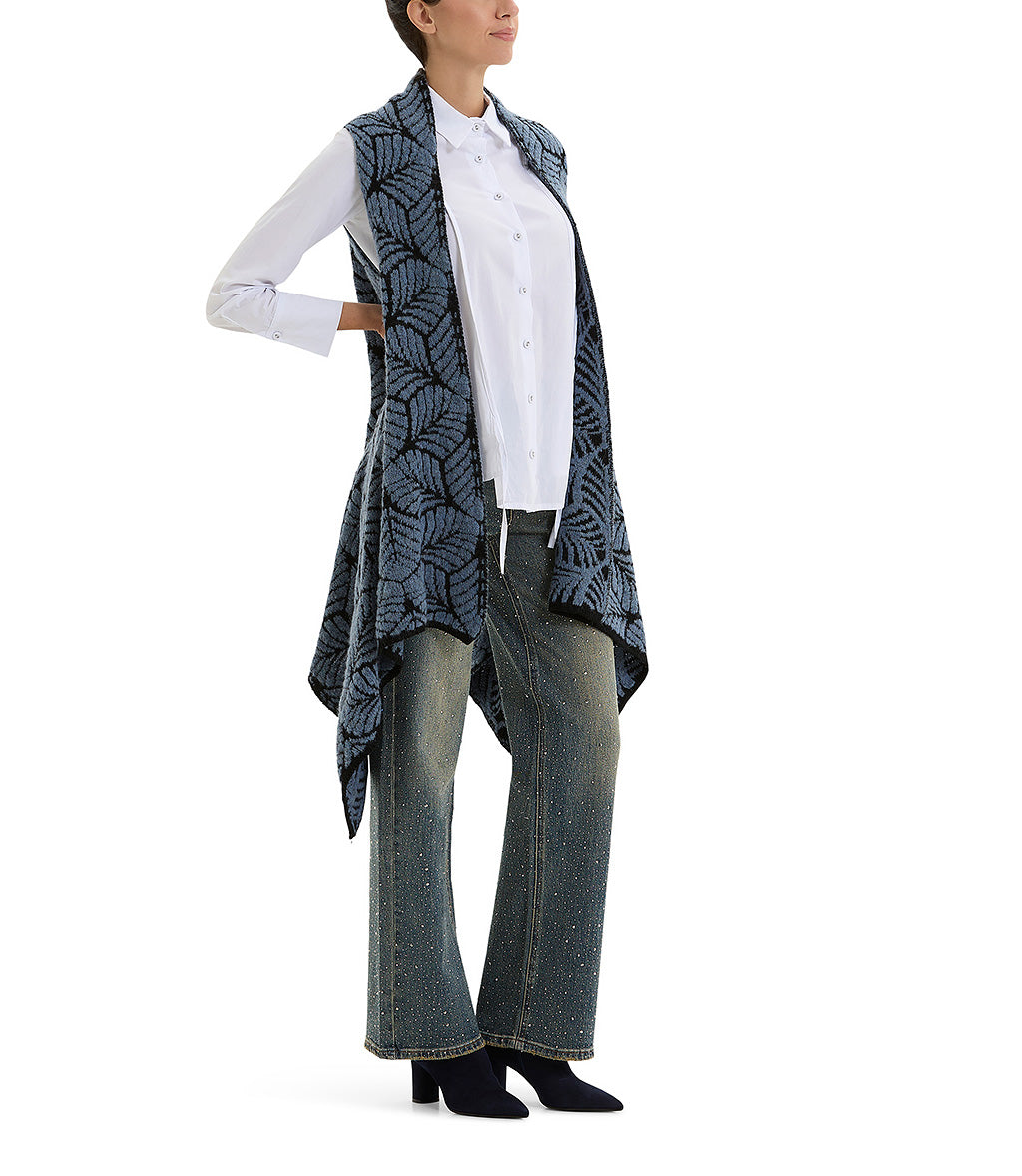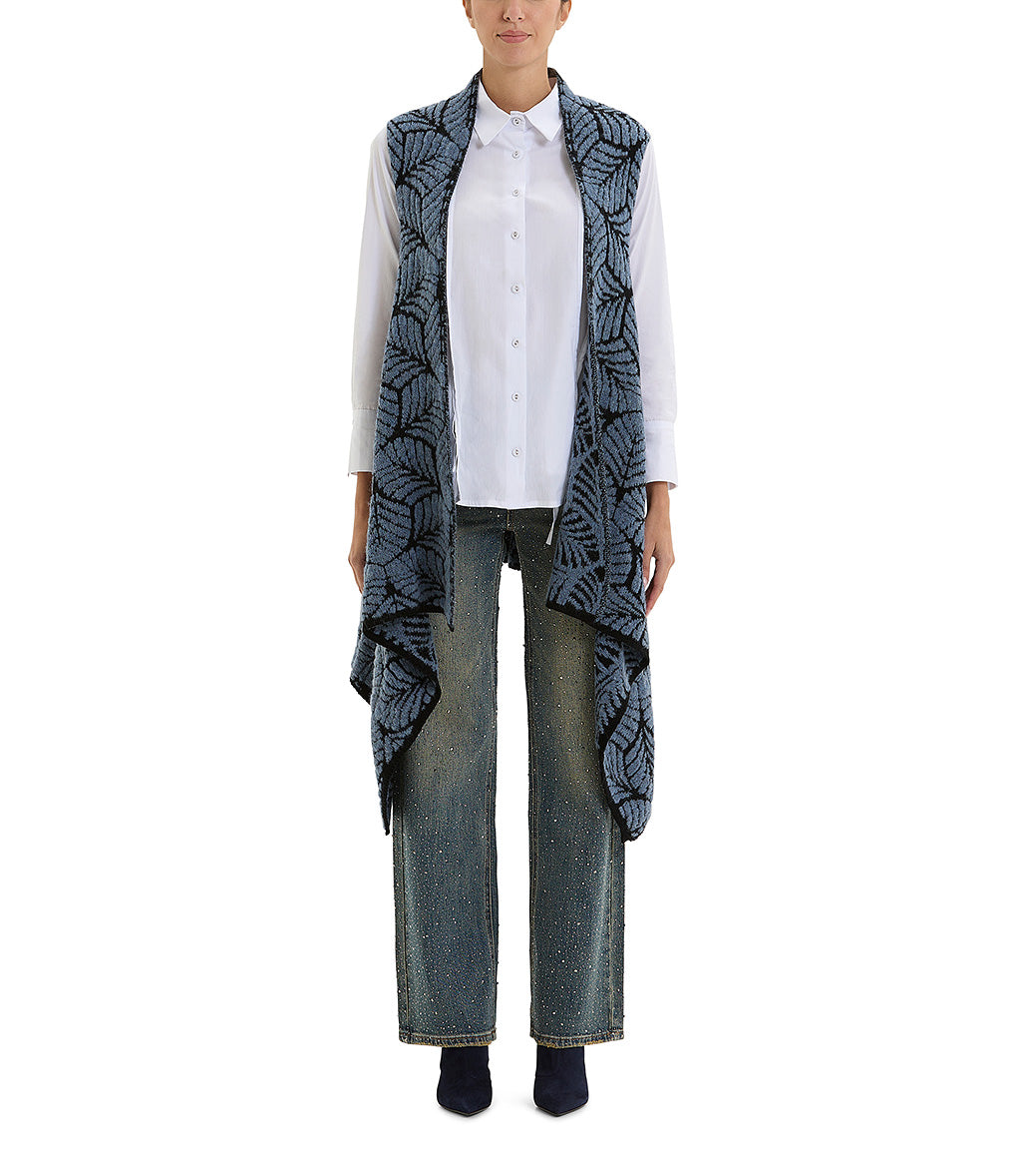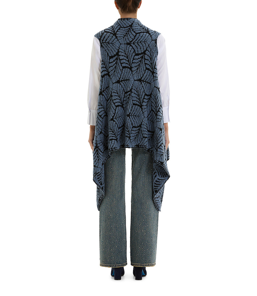 Long vest with stylized leaf motif in shades of blue and black. Sleeveless model, with shawl neck, without closure.
