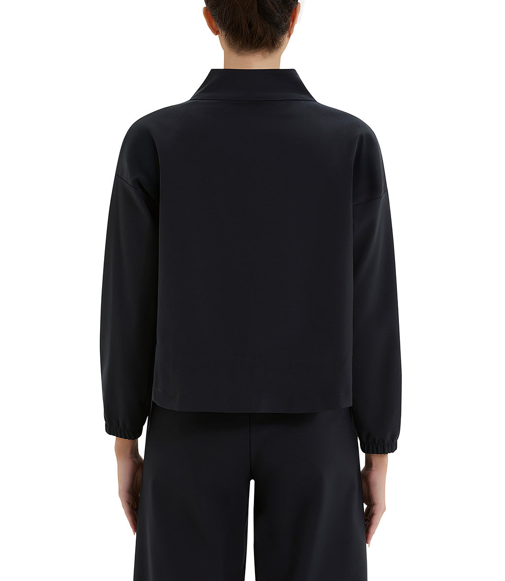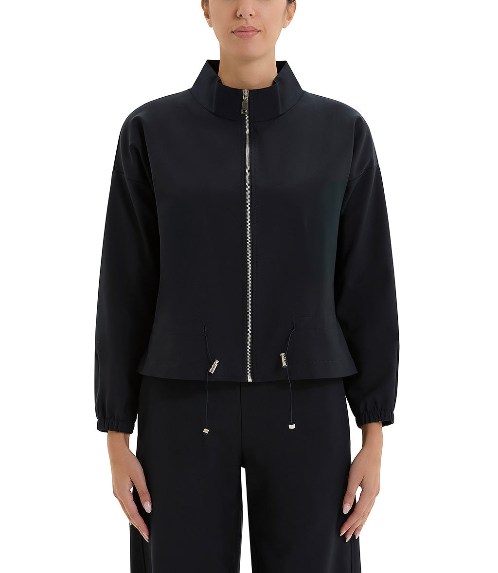 Cotton blue jacket, with silver metal zip, medium-height collar and silver cord stopper at the hem.