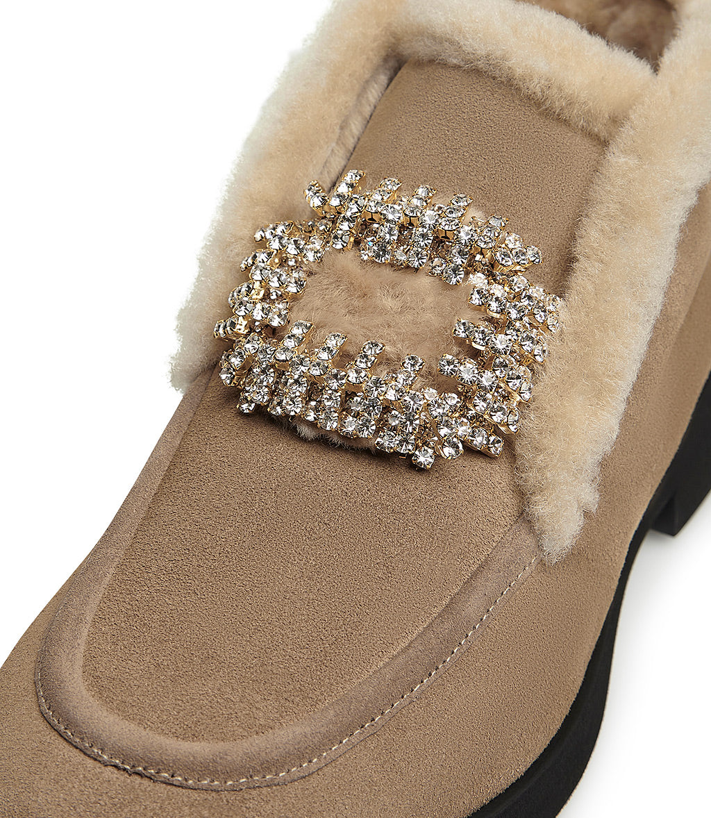 Jewel-buckle honey suede loafers