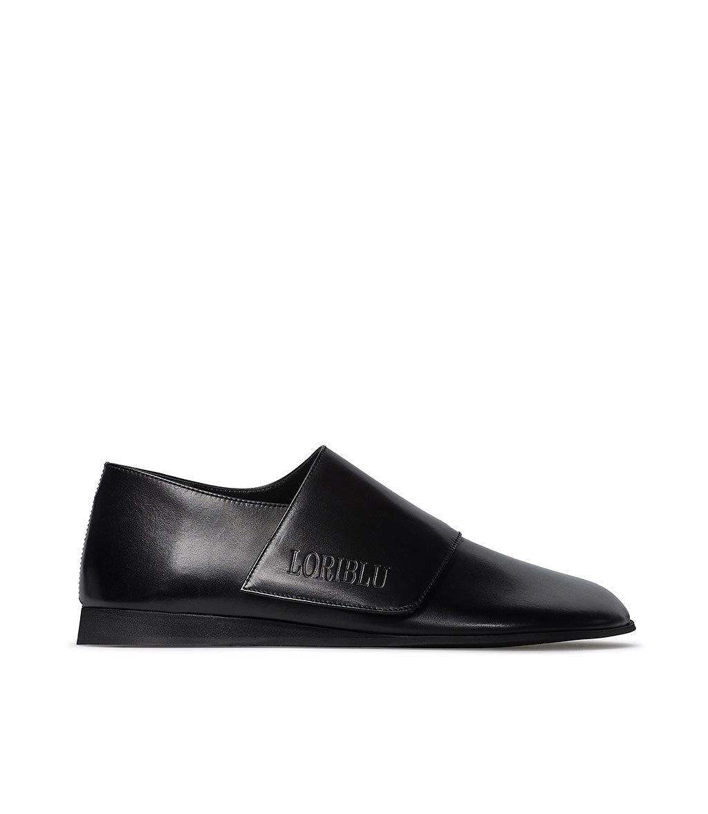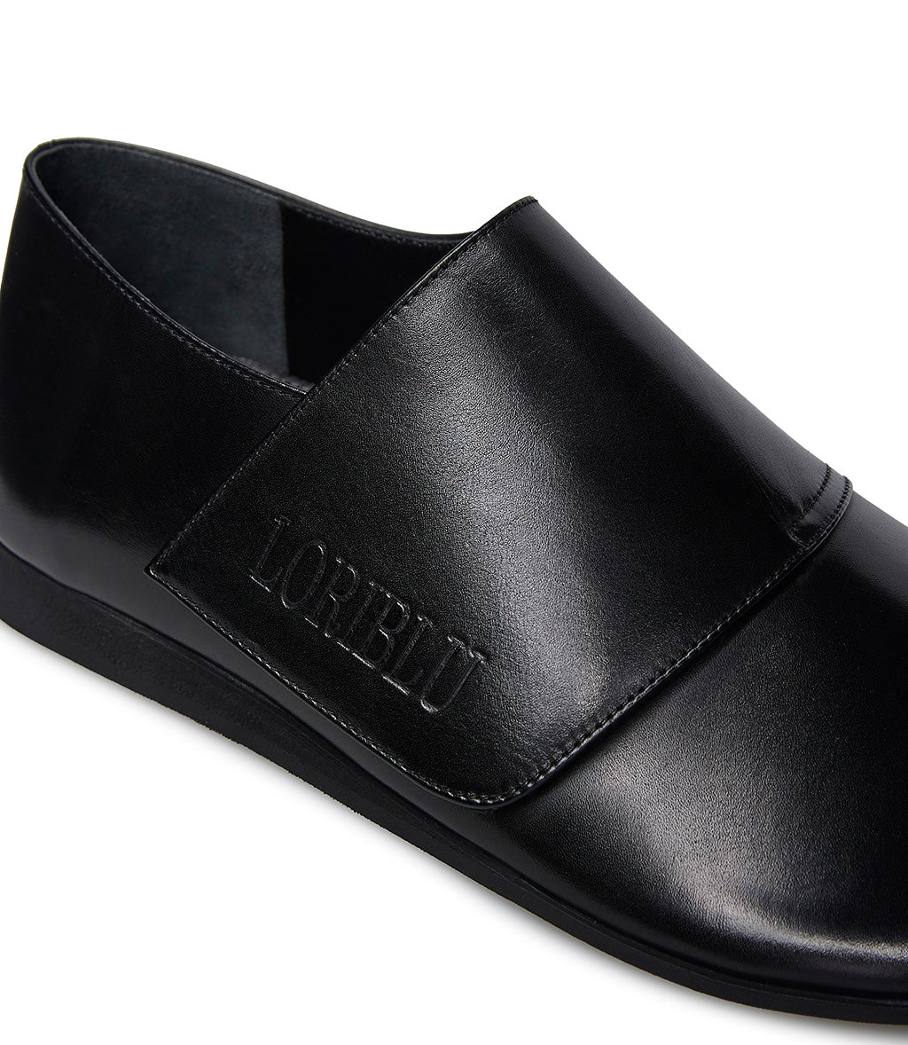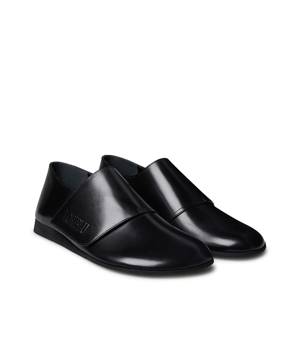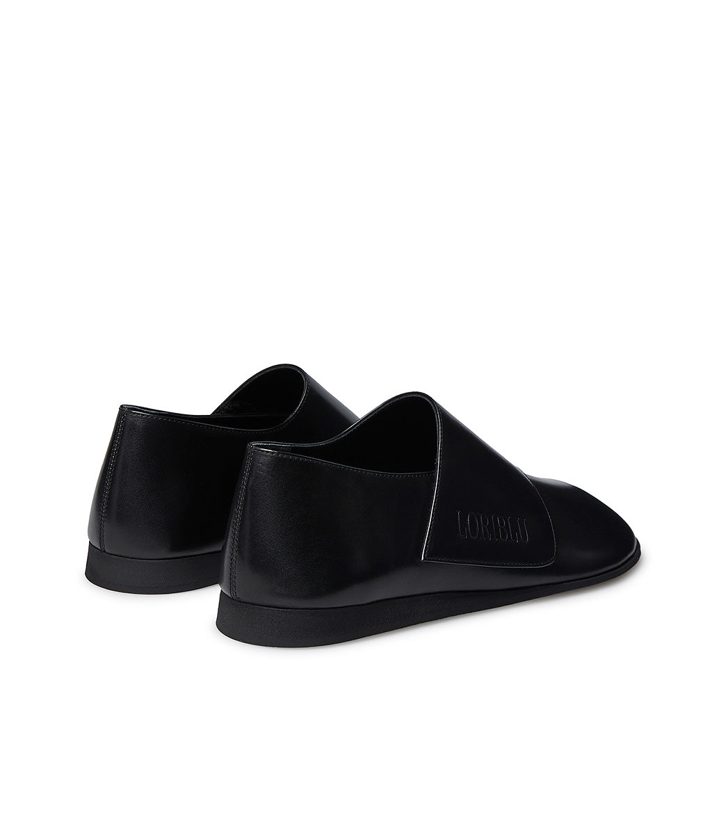 Black calfskin high-top loafer with a wide front band and side Velcro closure, internal wedge heel, and rubber outsole. The wide fit features this model with soft, ergonomic lines. Absolute comfort and versatility in a single style.