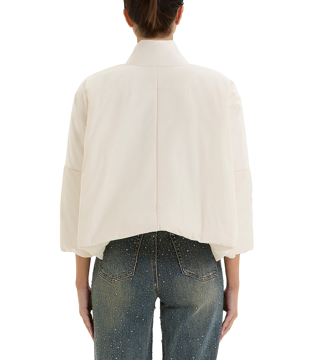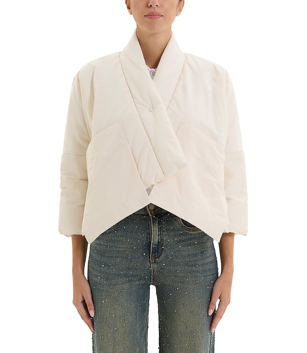 Butter-colored polyester down jacket with asymmetrical kimono neckline and closure with a diplomat button. It features large flap pockets on the front, with three-quarter sleeves.