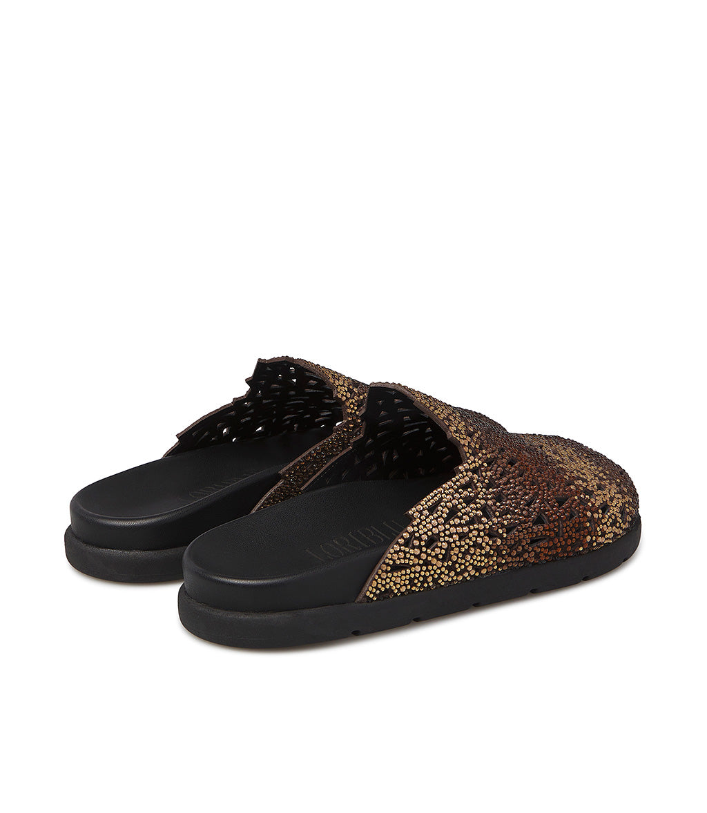 Fall in love with our exclusive dark brown suede mules. Crafted in Italy, they feature a rounded toe, cut-out upper embellished with gradient crystals in shades of brown and bronze, a contrasting black rubber platform outsole, and an ergonomic leather insole. Perfect for adding a touch of sparkle to your seasonal outfits without giving up comfort.