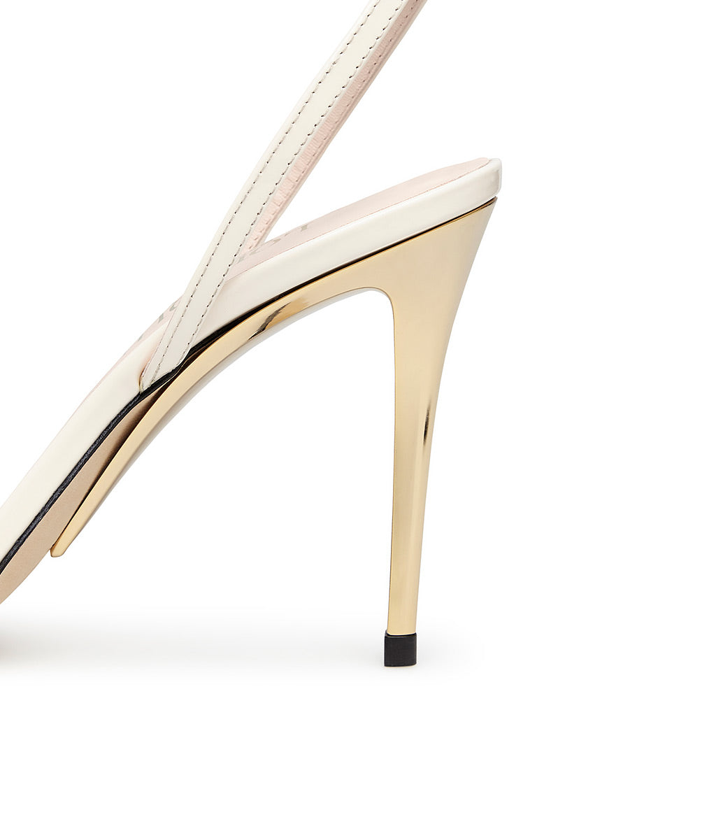 Perfect for adding a touch of glamour to your most exclusive looks, our 100% made in Italy sandals are crafted from milky-white patent leather. Elevated by a high gold metal sculpture heel, they reveal a rounded toe, a front band, a thin, adjustable ankle strap, leather lining and insole, and a leather sole. Accent them with contemporary outfits and special accessories.