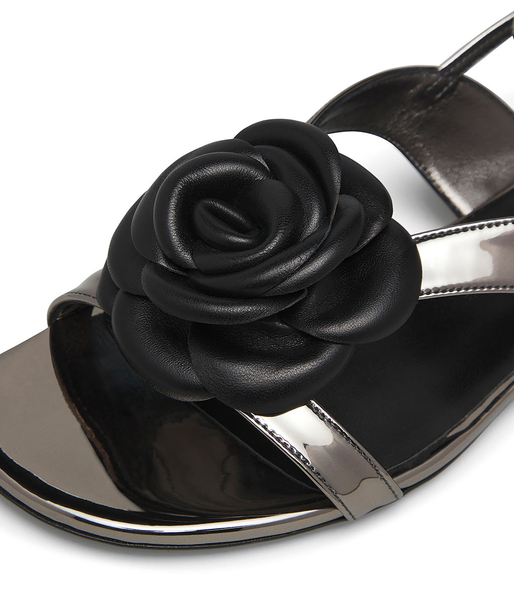 Charcoal-toned patent leather flat sandal with flower