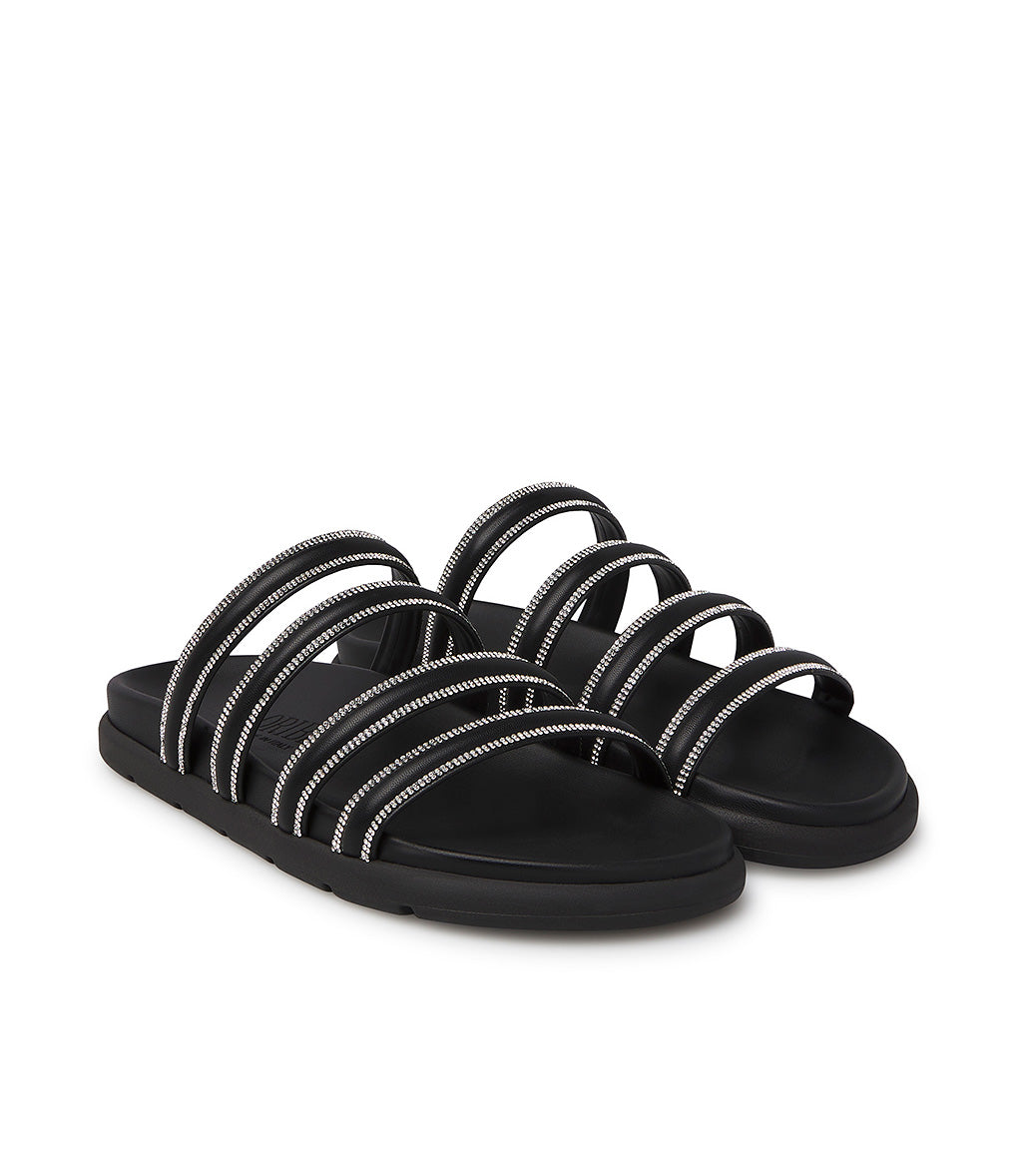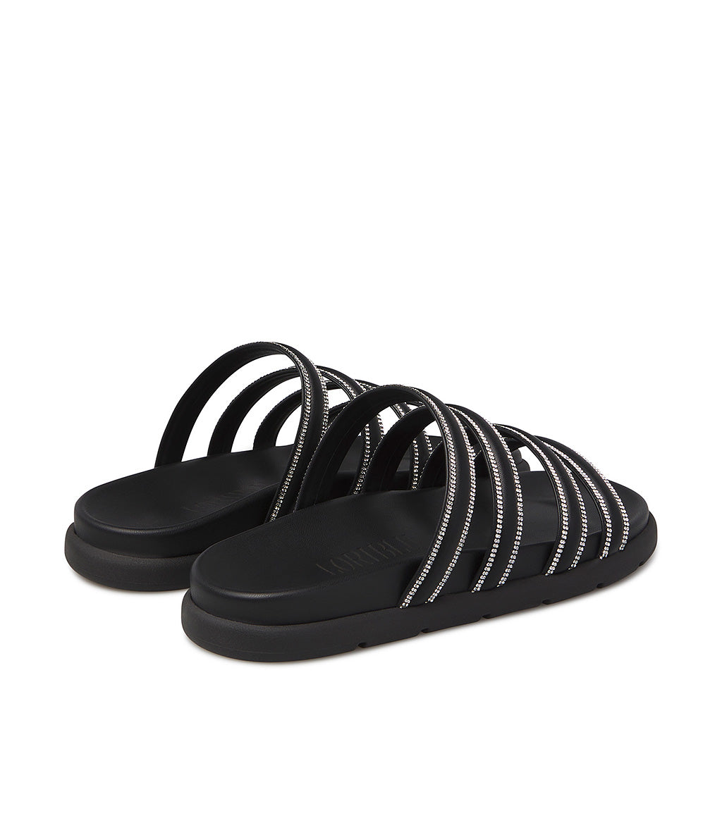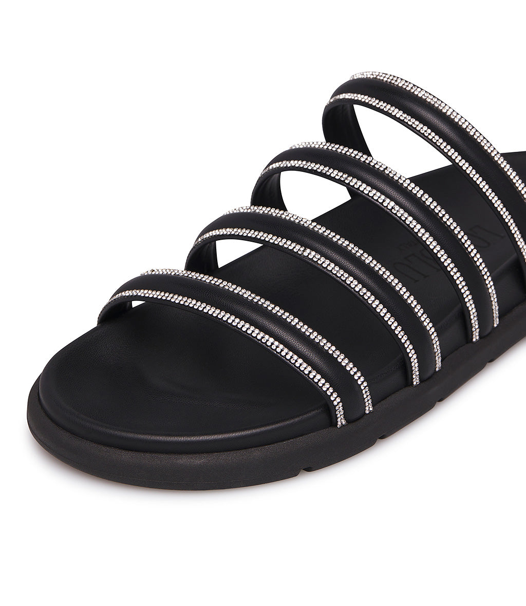 Perfect for everyday wear thanks to their comfortable yet elegant design and ergonomic platform sole, our flat sandals are crafted from premium black nappa leather. 100% Made in Italy, they stand out thanks to their strappy upper framed by tiny silver crystals. They feature a rounded toe and a medium-thick rubber sole with a slightly arched profile.