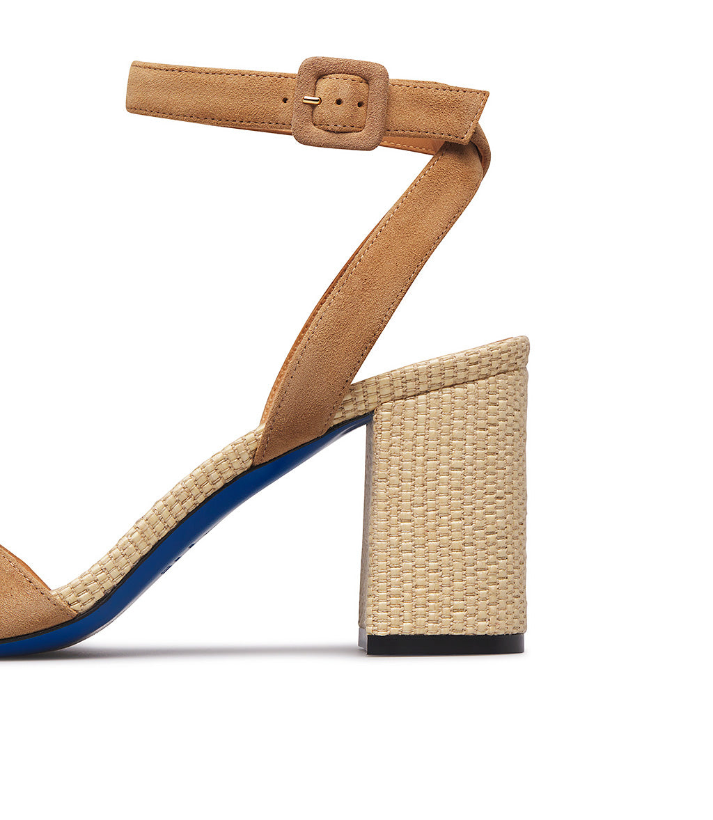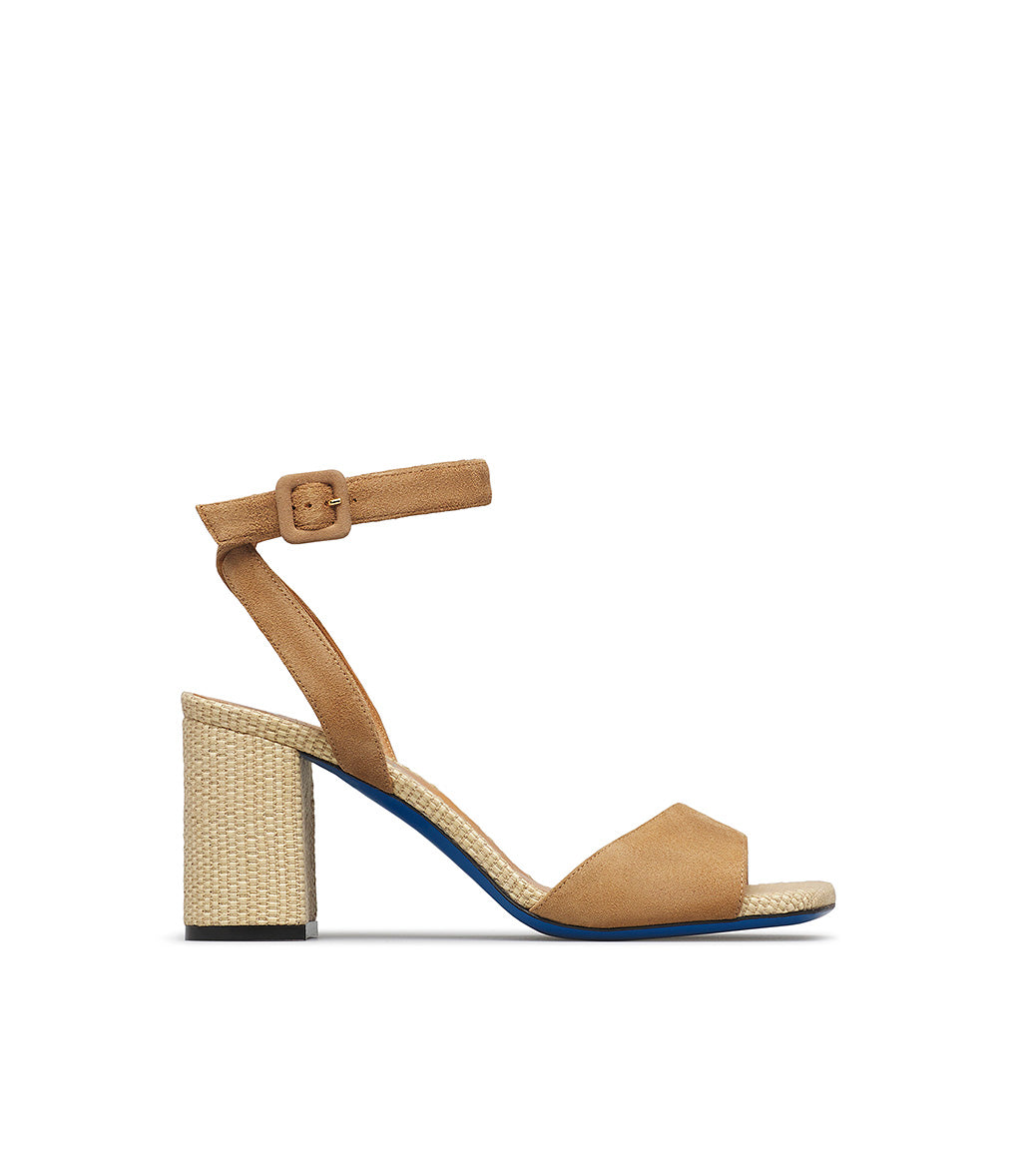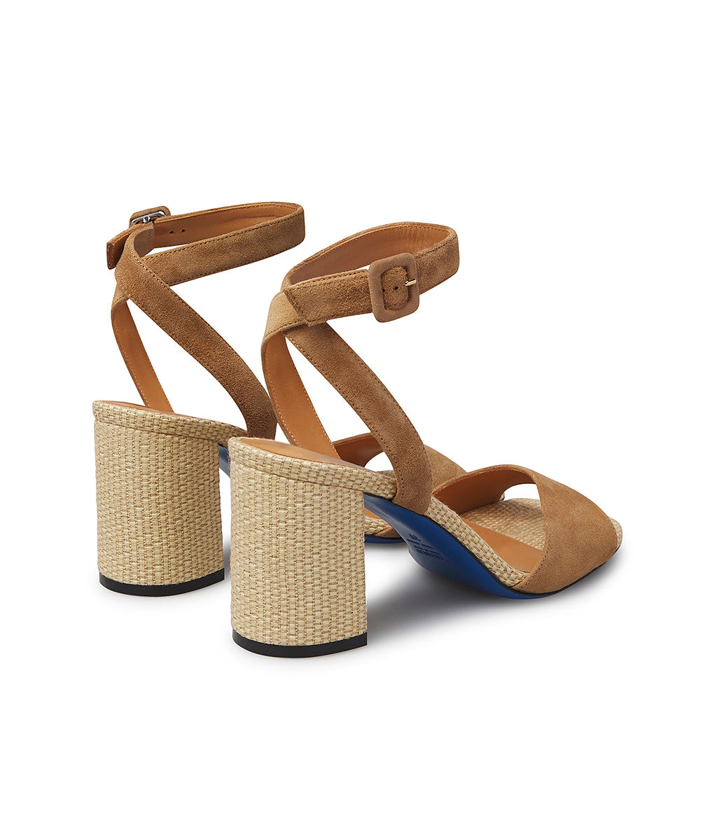 The sandals from the new collection feature an elegant design with a wide front band and ankle strap in tobacco-toned suede, a rounded toe, a comfortable high block heel in tone-on-tone woven fabric, and an iconic blue leather sole. Made in Italy, they're the perfect companion for your favorite summer outfits.
