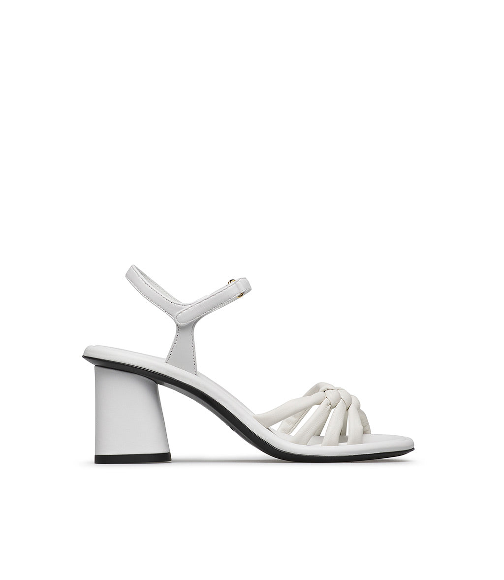 Our white nappa sandals feature an eye-catching design with knotted front straps, an ankle strap, and a comfortable, slightly flared mid-block heel. Rubber sole. Made in Italy, they're the perfect companion for summer outfits.