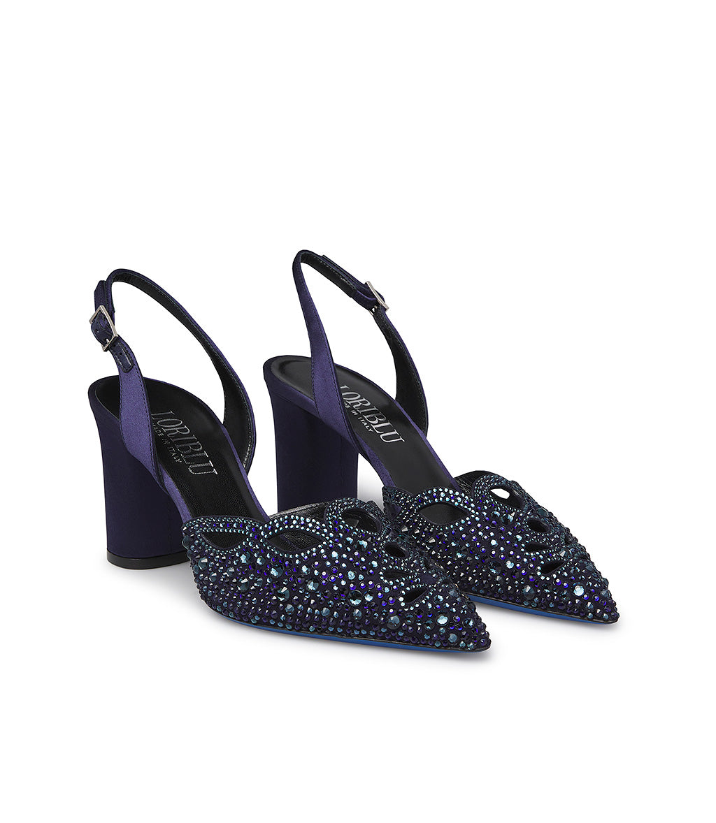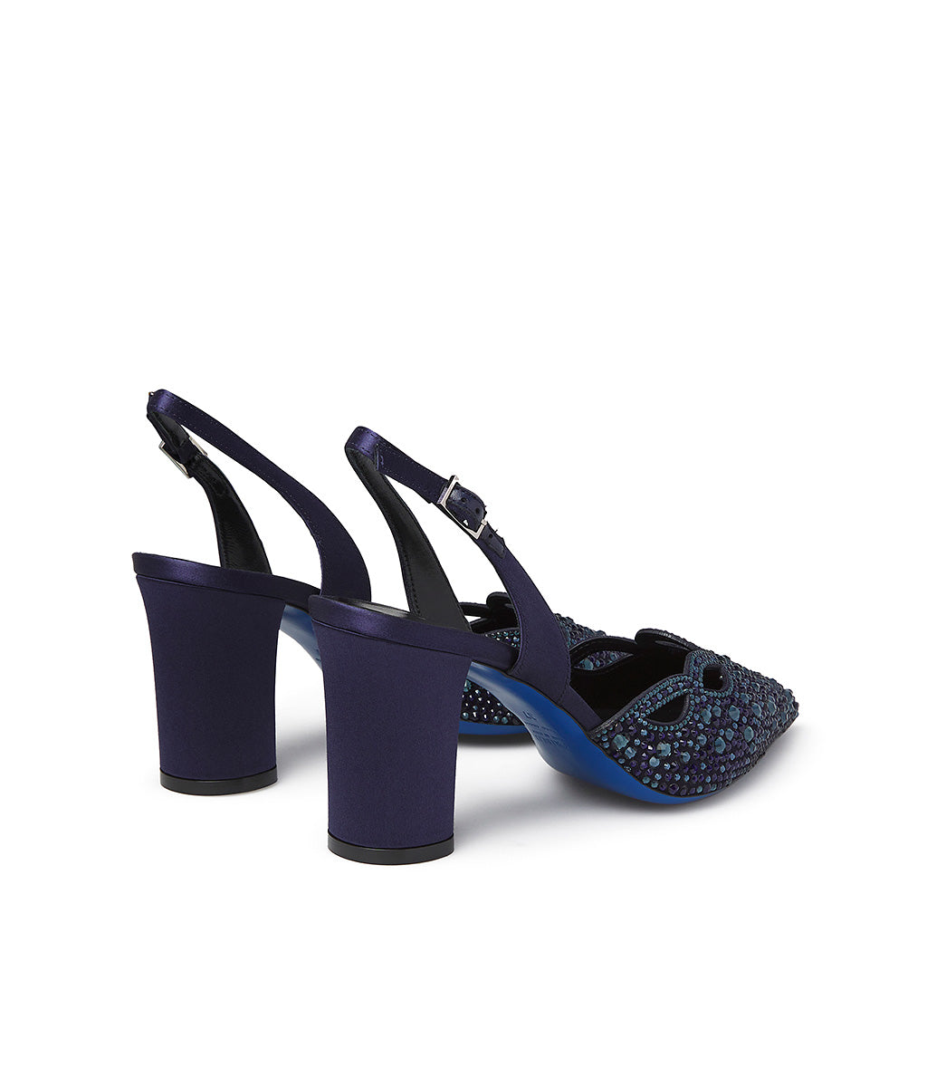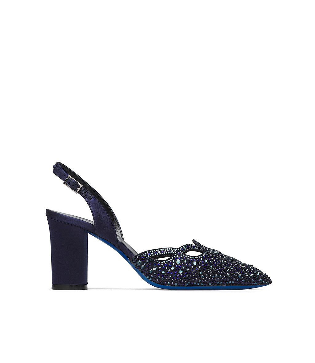 Glamorous and exquisitely refined, our jeweled slingbacks are perfect for completing your most special and exclusive formal outfits. Crafted in Italy from blue suede with a cutout design and embellished with tone-on-tone crystals, they feature a classic adjustable blue satin back strap, an iconic blue leather sole, and a comfortable blue satin block heel.