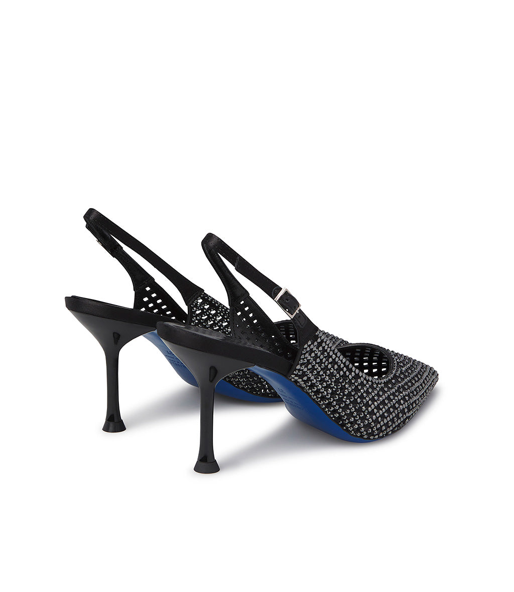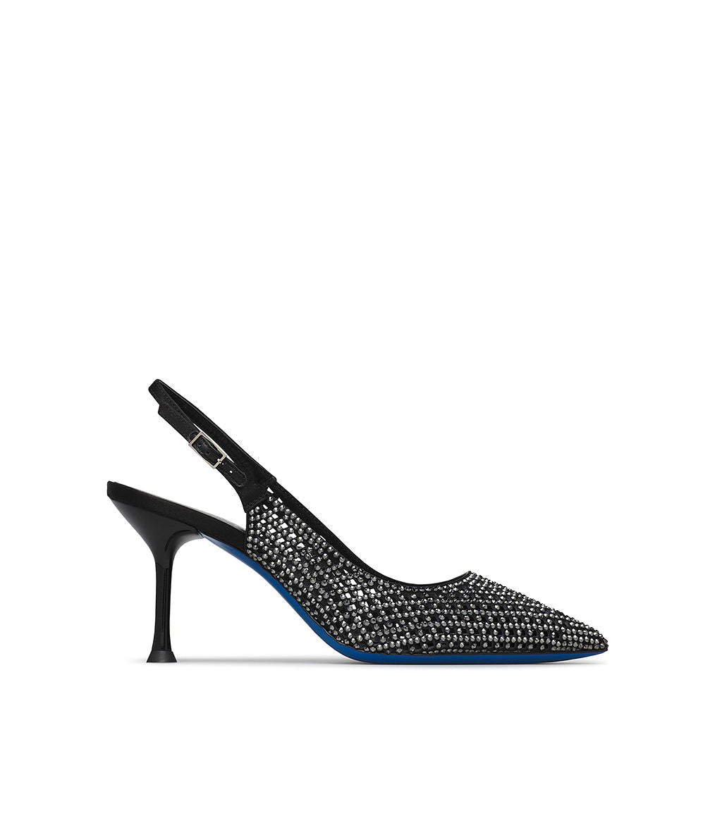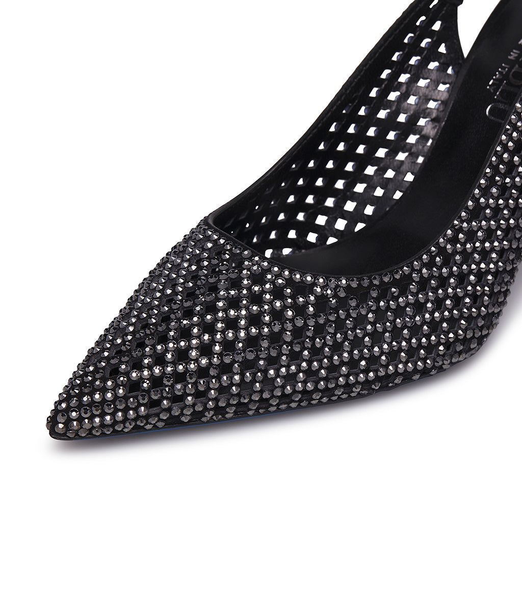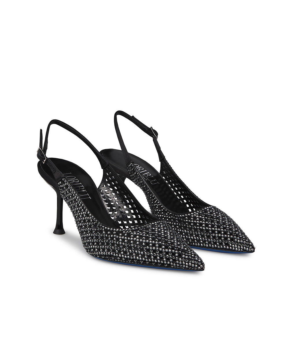 Feminine and elegant, the new jeweled slingbacks will win you over. The delicate black suede with a geometric cutout design, illuminated by sparkling silver crystals and the refined strap, create a unique accessory, featuring a pointed toe, stiletto heel, and the iconic Loriblu sole. Wear them for special occasions.
