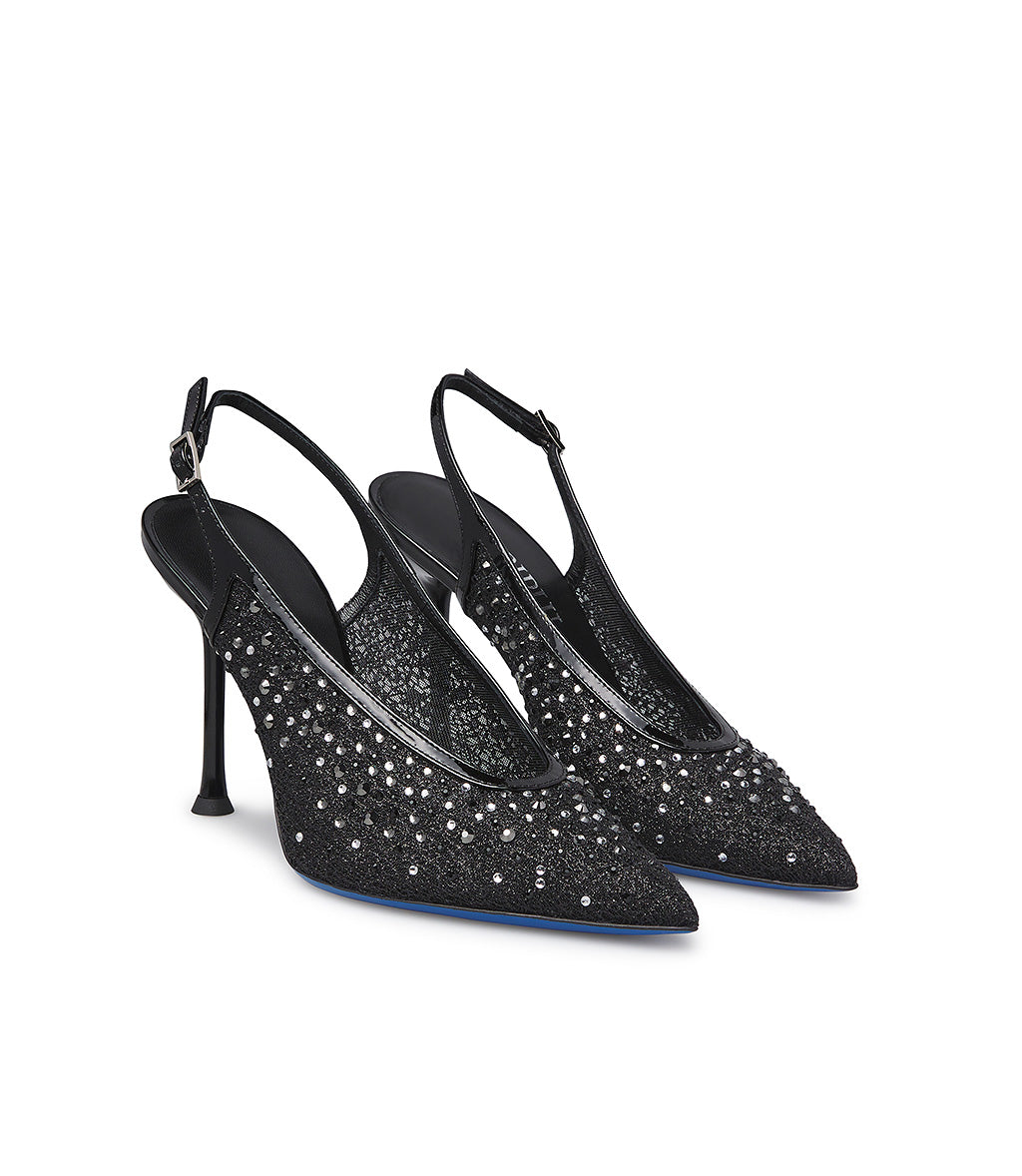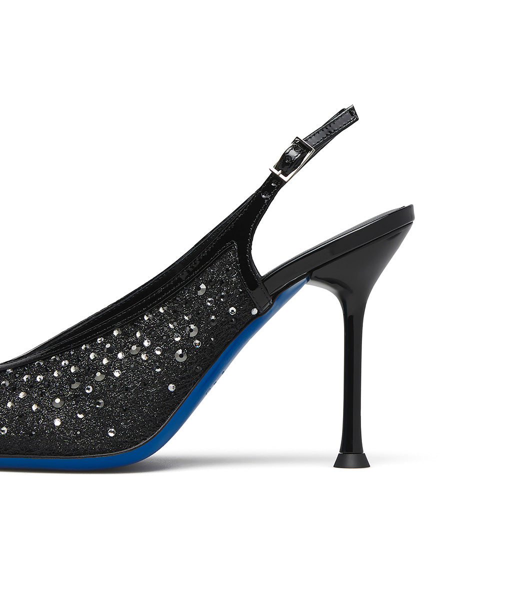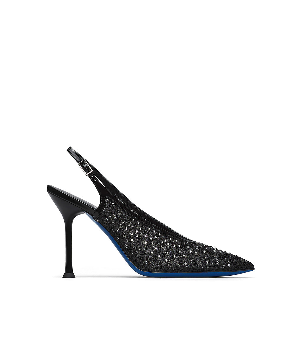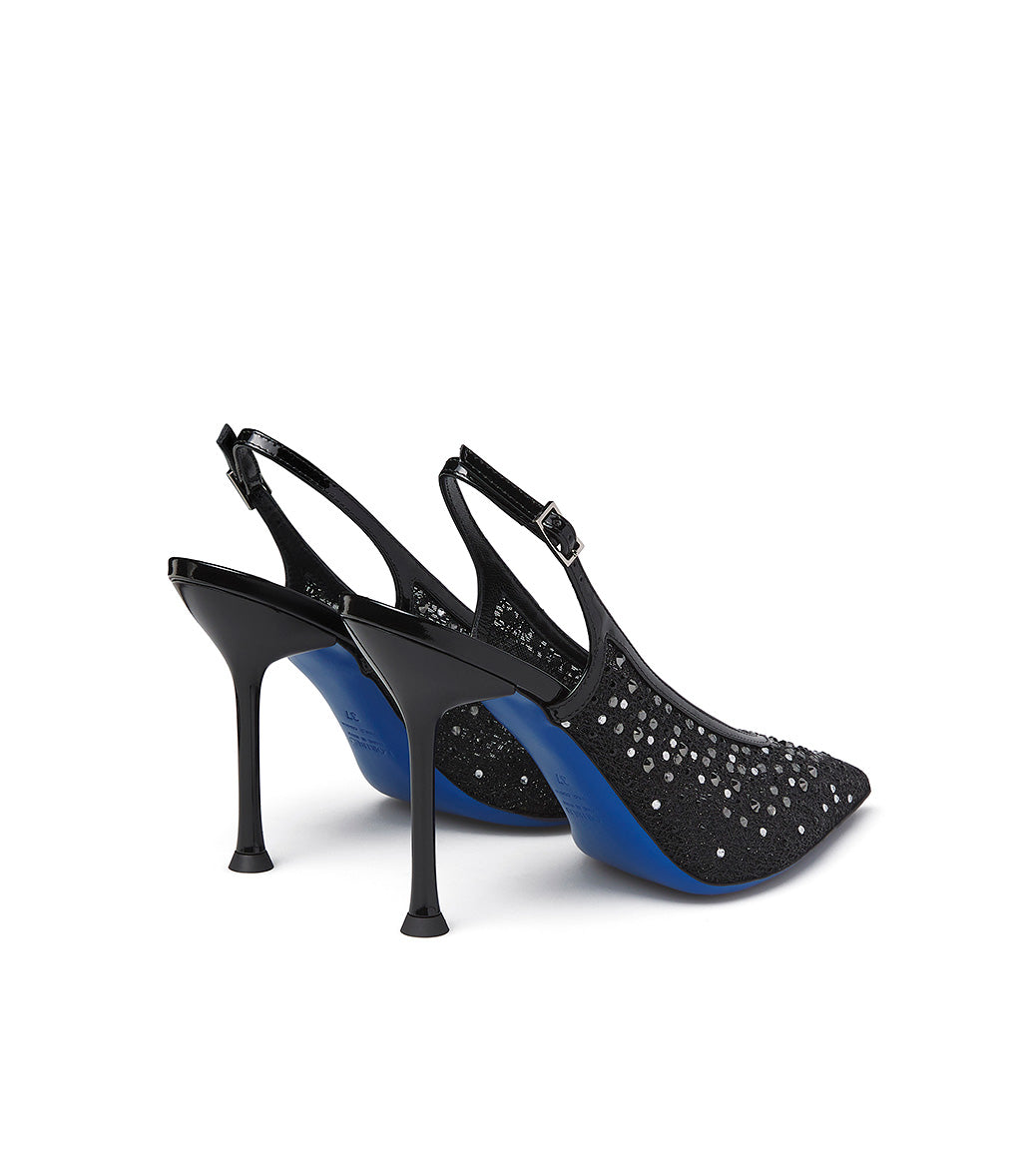 Glamorous and feminine, our jeweled slingbacks from the new collection are made in Italy, the perfect accessory for your most special and exclusive formal outfits. They're crafted in Italy from black tricot with patent leather trim and embellished with silver-toned crystals. They feature a rounded neckline, a classic adjustable back strap, an elegant stiletto heel, and an iconic blue leather sole.