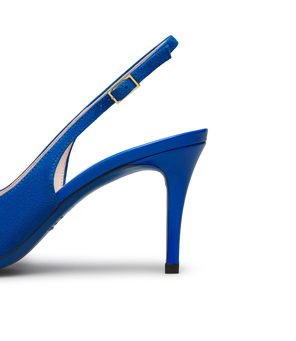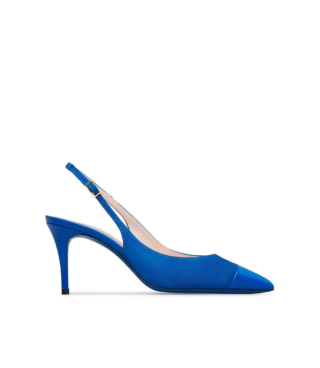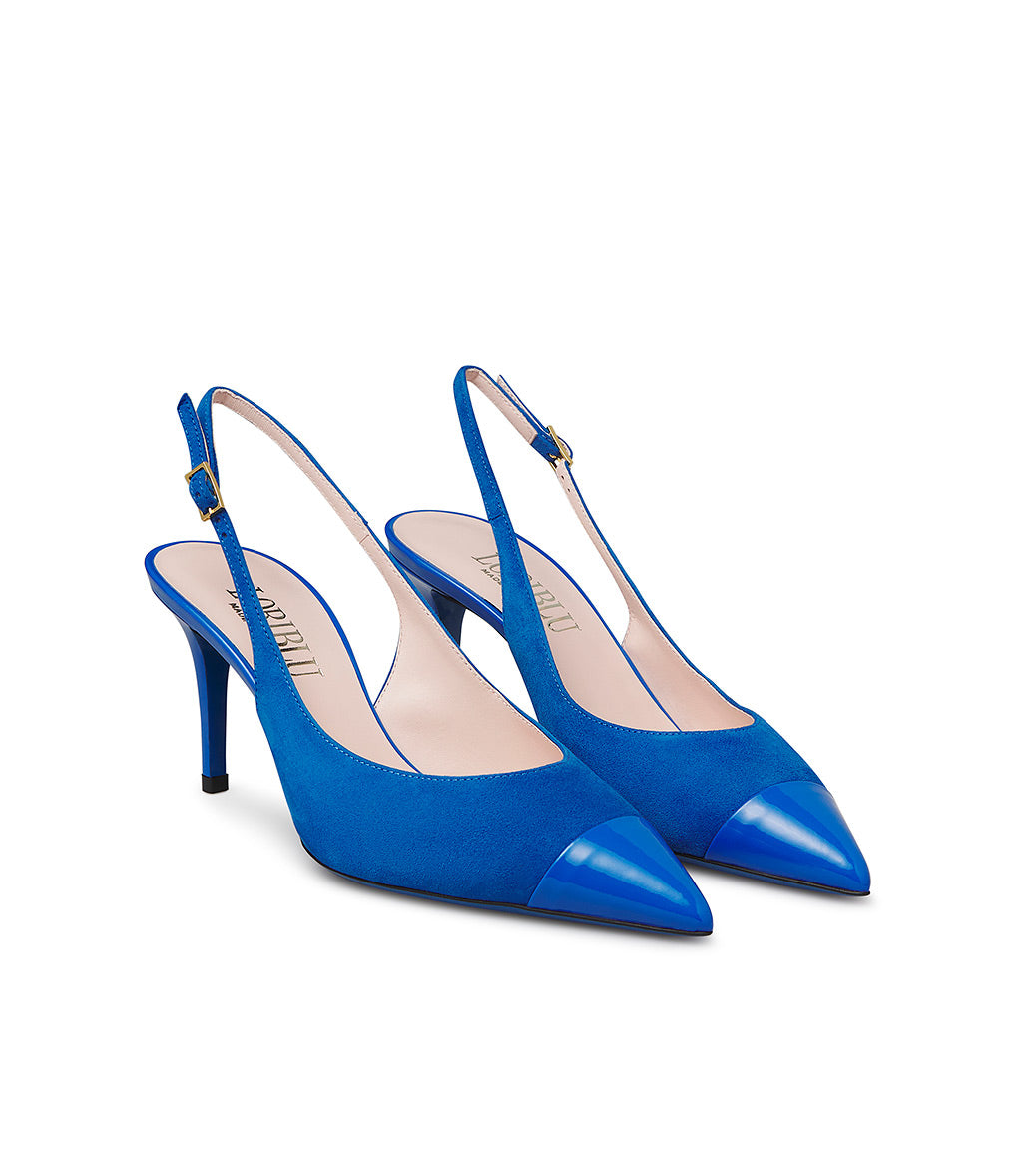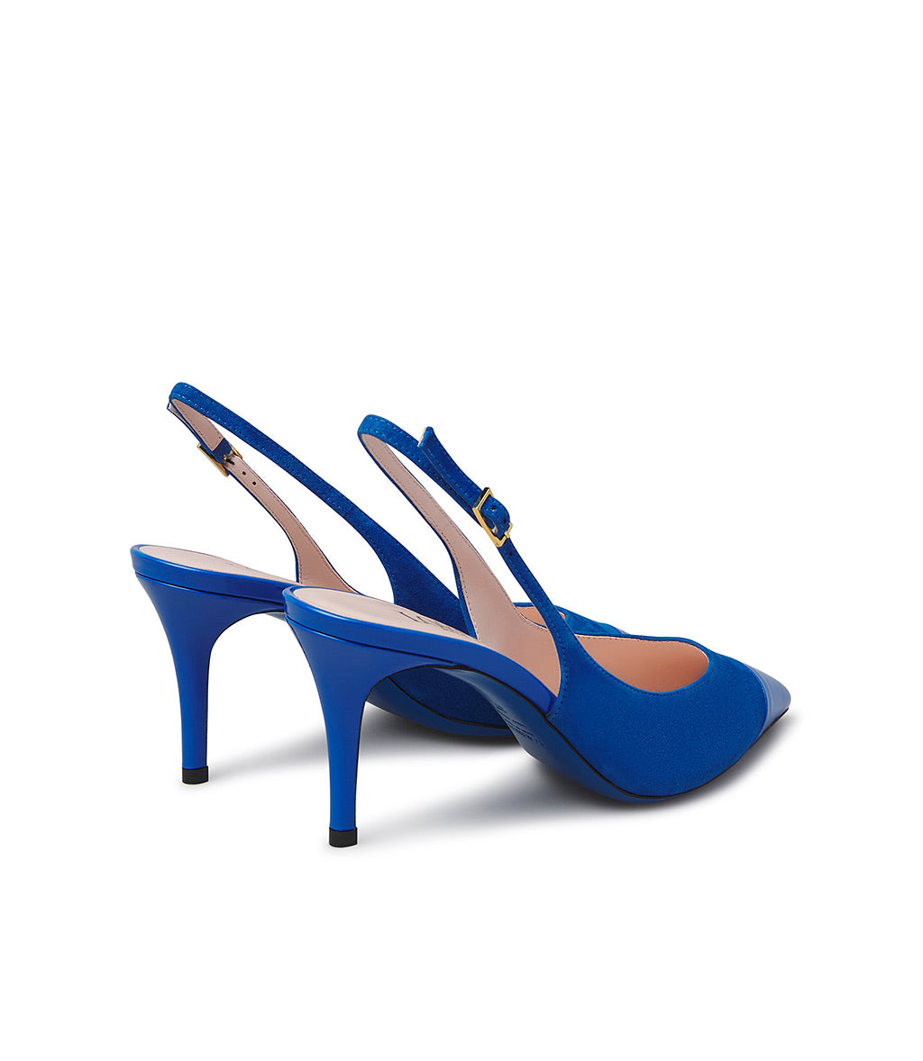 Elevated by an elegant stiletto heel, our slingbacks in premium bluette nuance suede with patent leather details enchant with their timeless elegance. The classic adjustable back strap and iconic blue leather sole complete the design. 100% Made in Italy.