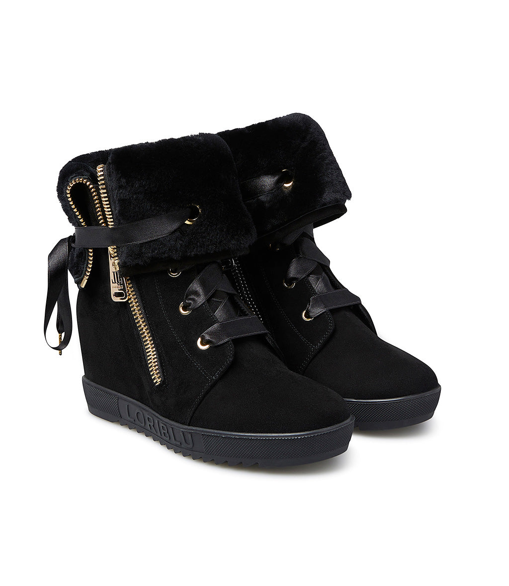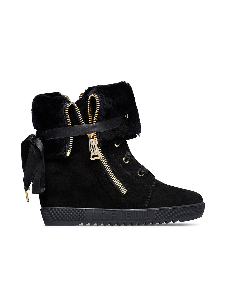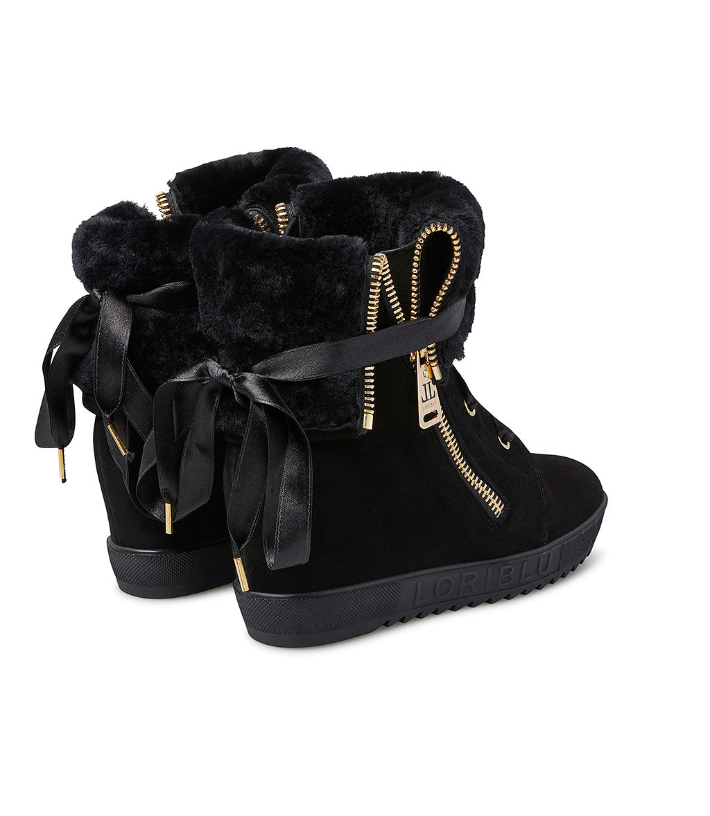 Crafted from black suede and featuring a contemporary design with a shearling cuff and internal wedge, the new Loriblu sneakers are perfect for those seeking comfort without giving up glamour. The gold metal side zip add a bold and refined touch, enhancing the model's bold style. These sneakers feature a rubber sole with an engraved logo, a side zip closure, and gold metal details.