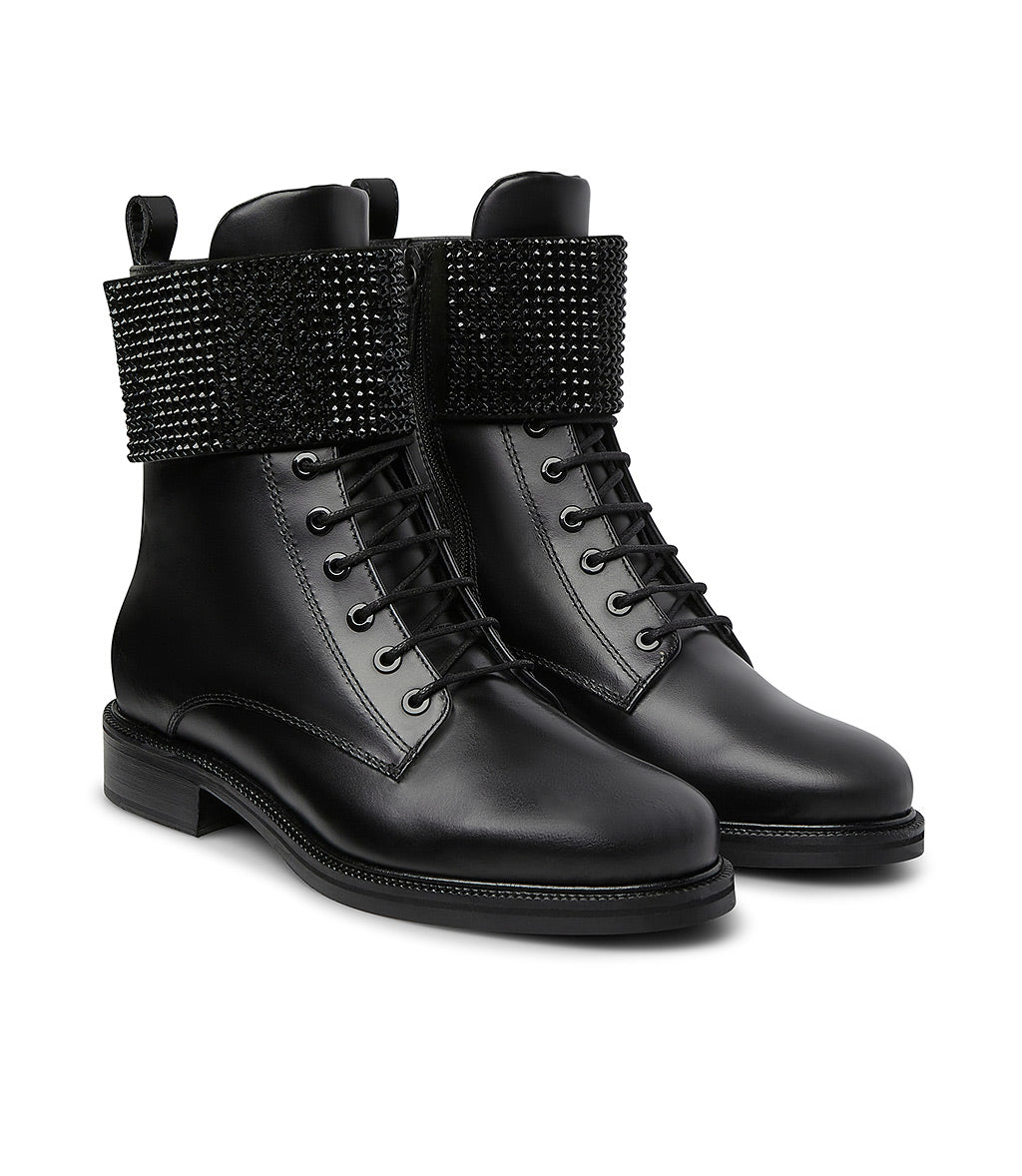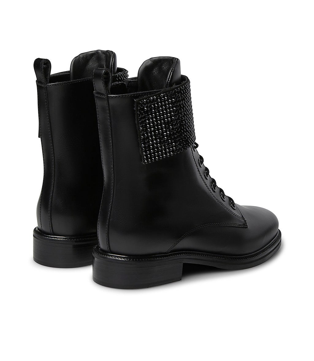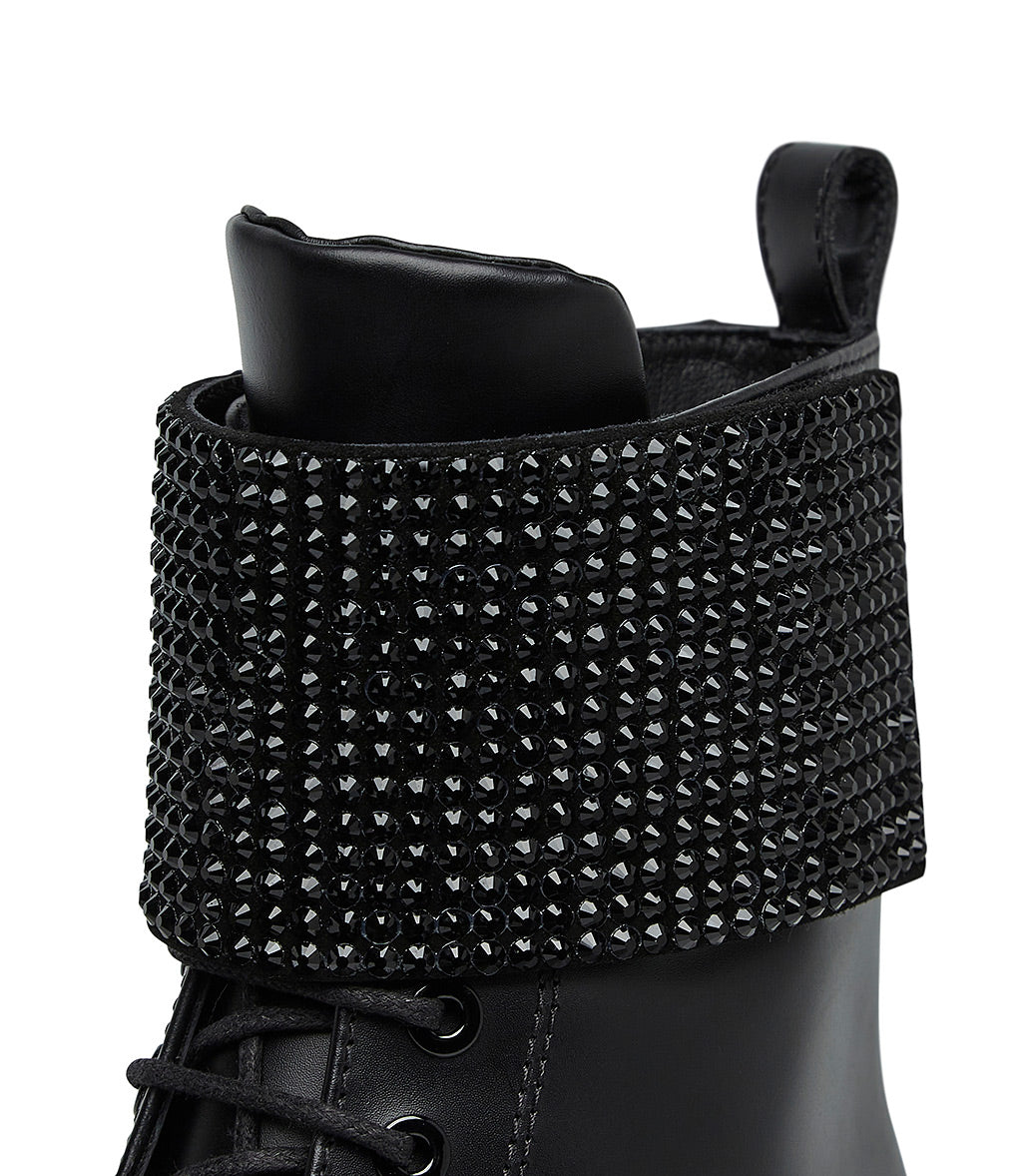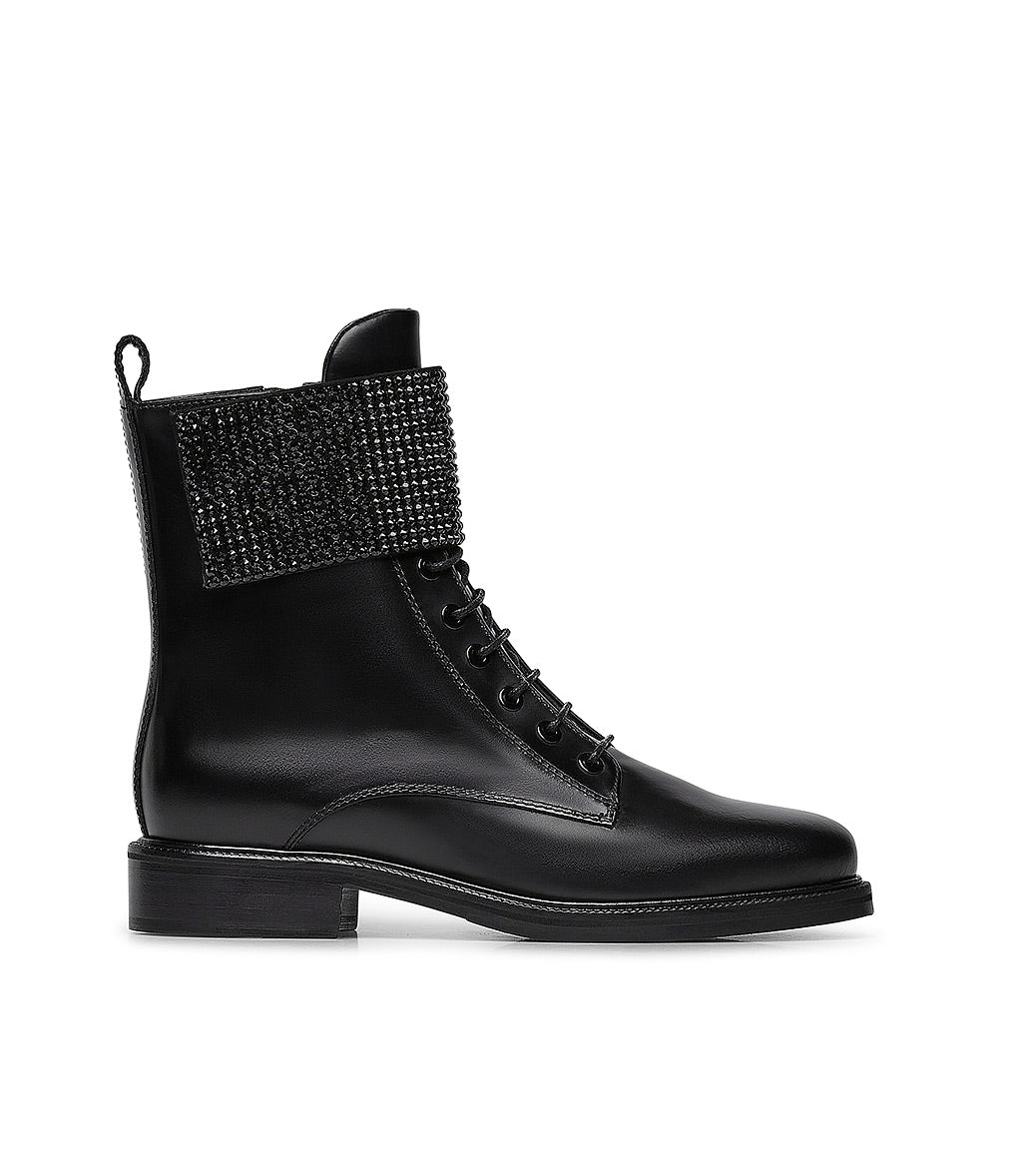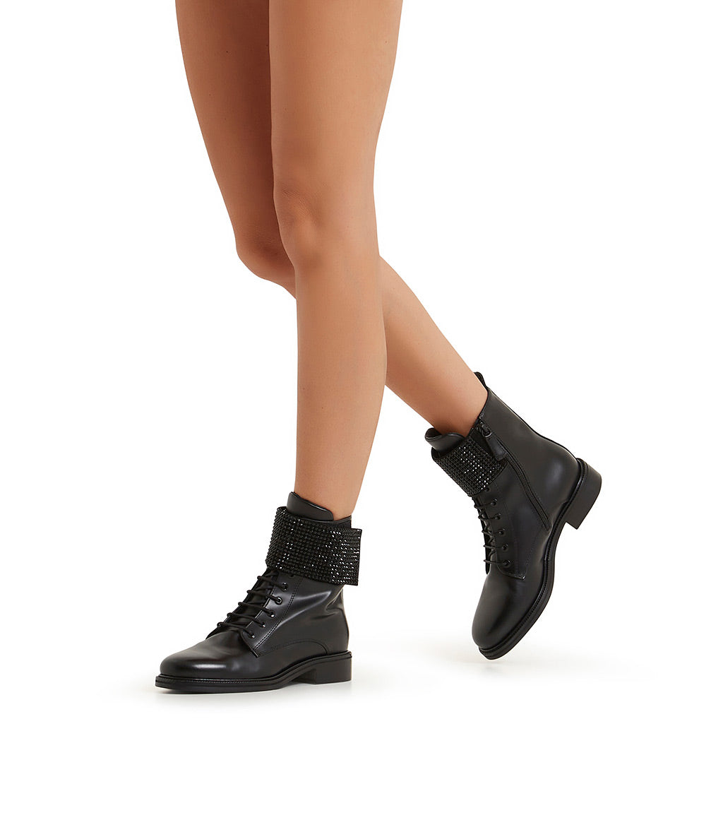 Rhinestoned-strap black leather ankle boots