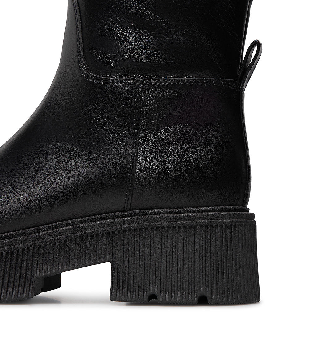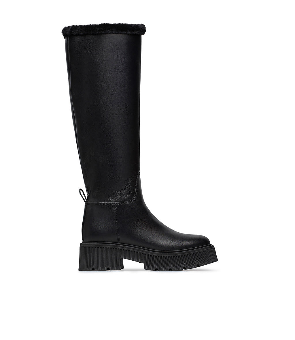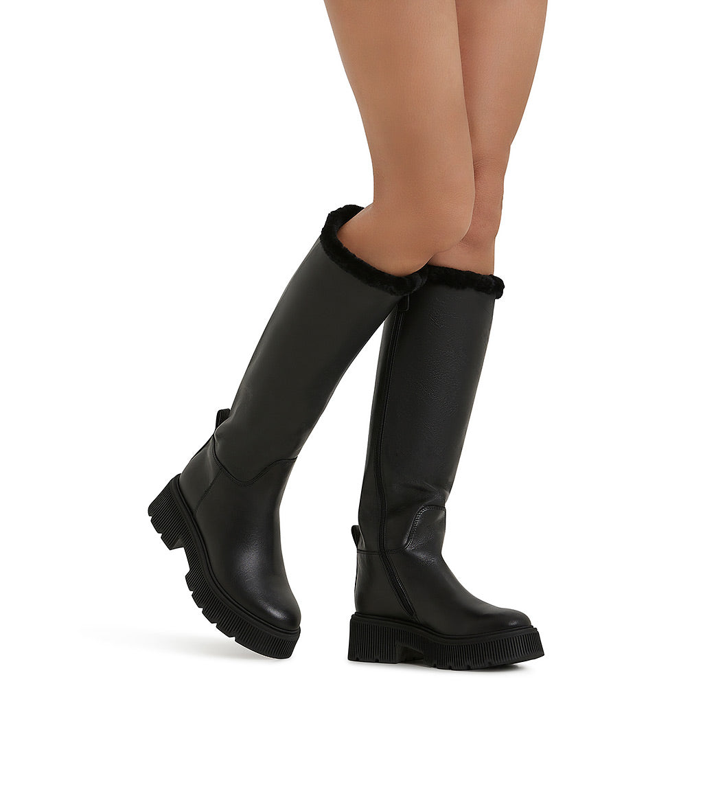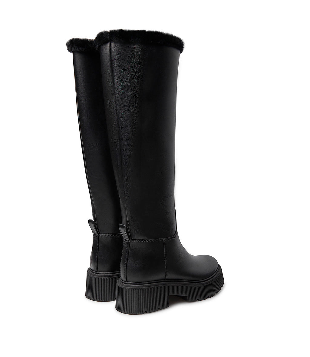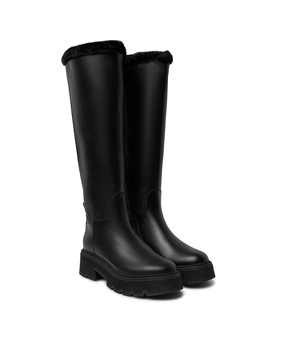 Ideal to wear during the coldest days of the season, our boots combine comfort and luxury to perfection. They are made in Italy from smooth black leather and reveal warm tone-on-tone shearling lining and edge, rounded toe, back loop tab, side zip fastening and chunky rubber sole.